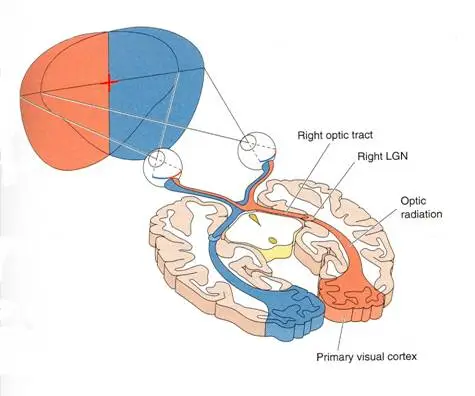 그림 1. 인간의 시각 처리 체계. 각 안구의 좌측 시야는 좌반구애서, 우측 시야는 우반구에서 처리된다. 가운데의 시신경이 교차하는 X자 구조물이 바로 optic chiasm이다.