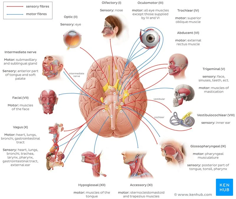 이를 잘 대변하듯, 인간 뇌에서 시각 정보를 받아들이는 V1과 V2지역을 합하면 전체 피질 넓이의 20% 를 차지하며(그림 3), 원숭이 연구에 따르면 피질의 55% 가 시각 처리에 직, 간접적으로 관여한다. 그뿐 아니라, 머리에 위치한 여러 기능들(표정 짓기, 눈 움직이기, 시각과 후각, 촉각 정보 전달하기...) 을 담당하는 12쌍의 뇌신경 중 무려 4개가 눈과 관련되어 있다(시각신경(II)은 시각 정보를 전달하며 동안신경(III), 활차신경(IV), 외전신경(VI) 은 각자 눈의 움직임에 관여한다,그림 4)! 신체는 필요 이상으로는 배정하지 않는 자린고비 원칙을 따름에도 이렇게나 많은 비율을 시각 처리에 배정한다는 것은, 그만큼 시각이 중요한 감각 양상임을 시사한다.