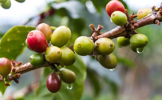 그림 1. 잘 익어가는 중의 커피 열매. 덜 익은 것(녹색) 부터 익어가는 것(붉은색) 이 달려 있다. 미주 1 참조.