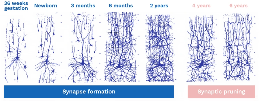 그림 8. 인간의 신경세포 배열. 그것은 생후 2년간 점점 추가되기만 하다가, 2년이 지난 후부터 점점 제거되며 모양이 다듬어지기 시작한다. 이것은 모두에게 고유한 뇌를 남긴다.