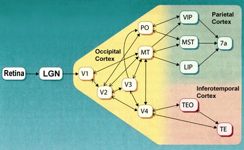 그림 6. 동물의 시각 처리 시스템. 그러나 이와 같은 모식도는 마치 뇌가 단방향적이고 직렬적으로 작동한다는 오해를 갖게 한다. 아래 문단 참조.