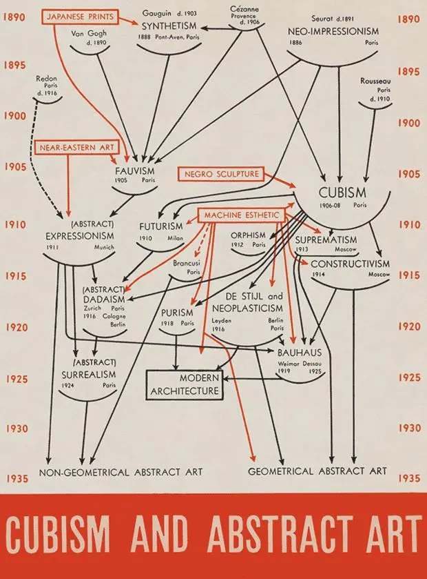 그림 3. '현대 미술의 계보'. 이러한 변혁의 촉발은 사진의 도입과, 전쟁과 같은 사회적 변화였다.