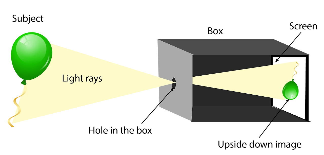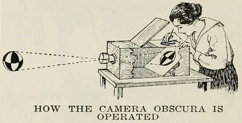 그리스 시대의 아리스토텔레스는 아주 자그마한 구멍을 지나간 빛이, 그 뒤에 선명한 상을 맺는 것을 발견했다. 초등학교 때 배우는 바늘구멍 사진기의 원리를 관찰했던 것이다. 이것은 간단한 광학 원리 때문인데, 한 점에서 나온 빛이 다른 점에서 모이게 된다면 그것은 우리가 관찰 가능한 상을 형성하게 되기 때문이다(그림 4). 즉, 외부 풍경을 마치 픽셀처럼 정확히 나누고, 그 각 픽셀에서 출발한 광선이 아주 자그마한 구멍을 통과하면 180도 뒤집어진 곳에 정확히 다시 정렬하게 되므로 상을 맺게 되는 것이다(구멍이 커지게 되면, 여러 곳에서 들어온 빛이 큰 구멍을 통과하여 한 군데에 모이므로 매우 흐릿한 상을 맺게 된다: 이것은 우리가 눈을 찌푸리면 상이 약간이나마 선명해지는 이유이기도 하다). 천 년도 더 지난 후, 화가들은 이 원리를 이용하기 시작했다. 레오나르도 다 빈치를 위시한 학자들이 이러한 빛의 성질을 이해하고, 이해를 통해 현실에 적용할 수 있는 도구를 만들어 낸 것이다. 그것이 바로, '카메라 옵스큐라'다.