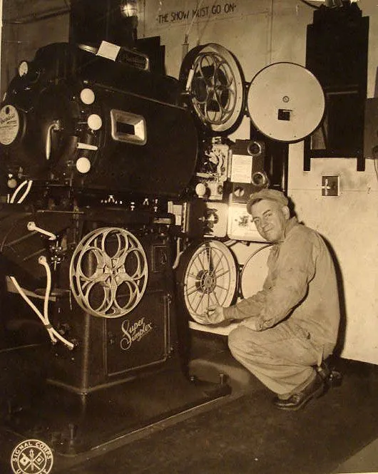 그림 6. 클래식한 필름 영사기. 흔히 캠코더에 대한 아이콘으로 사용되는, 네모난 몸체에 둥근 필름 릴이 붙은 아이콘은 이 형태를 본딴 것이다.