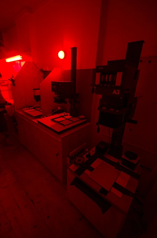 그림 4. 흔히 그려지는 인화실(dark room). 붉은 조명은 당연히 음산한 분위기 조성을 위한 것은 아니고, 인화지의 반응을 막기 위한 것이다.