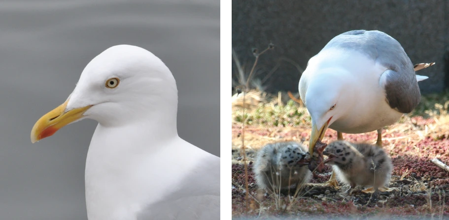 그림 5. 재갈매기의 어미 부리에 있는 붉은 점. 새끼들은 이 점을 보면 쪼는 행동을 보이는데, 이렇게 반응을 유도하는 자극을 심리학에서는 해발인releaser 라고 부른다.