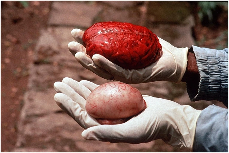 그림 5. 침팬지의 뇌와 고환. 몸 대비 고환 크기는 생식 패턴을 짐작케 하는 지표 중 하나이다. 미주 6번도 같이 참고하라.