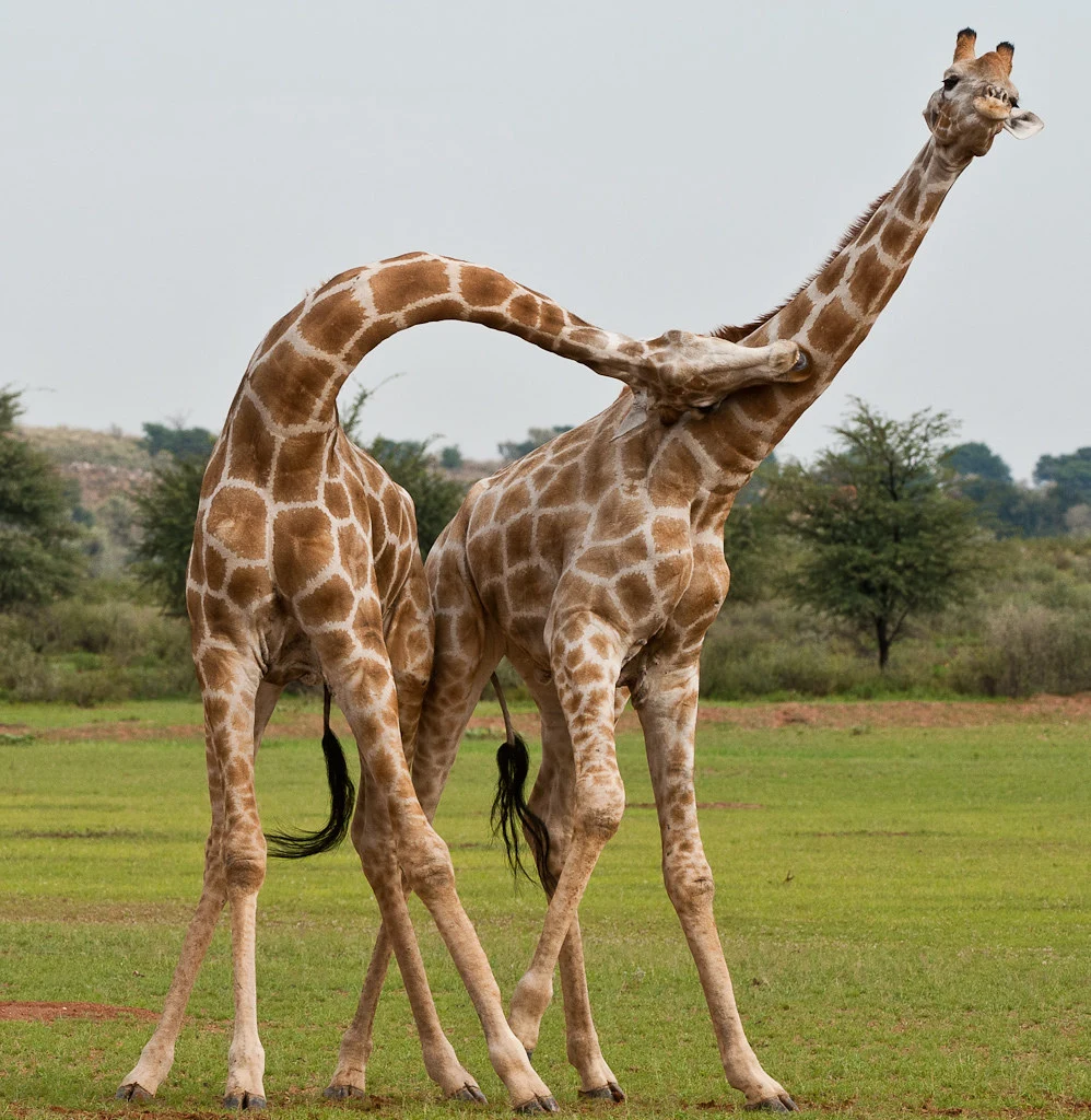 그림 3. 기린의 <목 싸움>. 기린이 목이 긴 이유는 높은 나무를 뜯어 먹기 위해서가 아니라, 짝짓기 경쟁자를 더 강하게 공격하기 위해서라는 주장이 있다!*