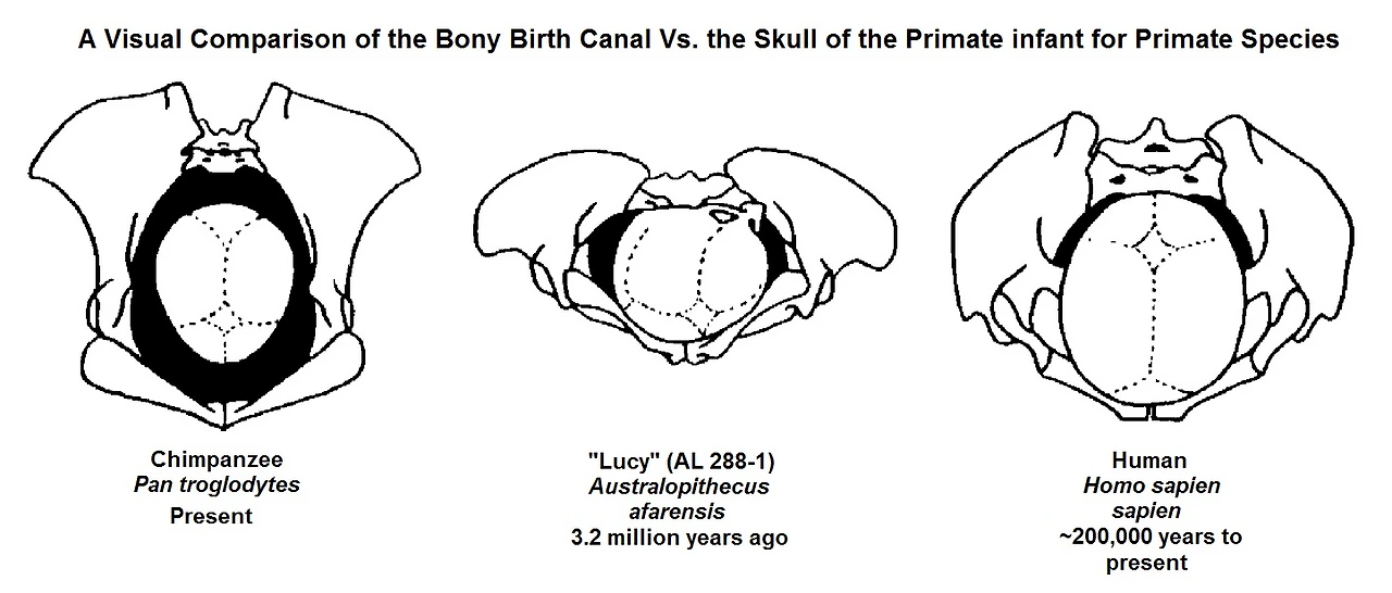 그림 6. 침팬지와 인간, 그리고 그 사이 오스트랄로피테쿠스 "루시" 세 종의 골반과 두개골 크기 비교. 인간에서 너무나도 커진 두개골 대비 골반은 충분히 크지 못하다.