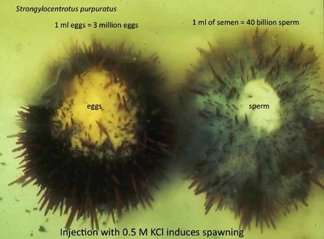 그림 1. 많은 수상 생물들은 난자와 정자를 물 속에 대량으로 뿜어낸다. 사진은 성게. 식용 해산물들에 맛 좋은 생식소가 그렇게 듬뿍 들어 있는 이유는 이 때문이다.