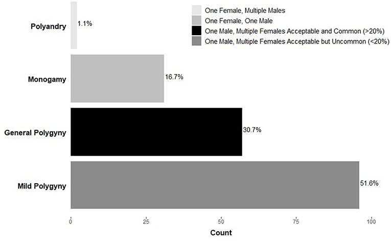 미주 6. 이를 간접적으로 뒷받침하는 해부학적인 증거들이 있는데, 하나는 수컷-암컷 간의 크기 차이다. 수컷 하나가 많은 암컷을 거느리는 종일수록 수컷은 암컷보다 현저히 큰 반면, 그렇지 않은 종은 경쟁 요소가 줄어듦으로 수컷이나 암컷의 크기가 비슷하다. 아주 강한 일부다처제인 고릴라는 암컷보다 수컷이 2배나 큰 반면, 인간은 15% 큰 것에 그친다. 두 번째는 몸의 체적 대비 고환의 크기인데, 난교성 동물들은 자신의 수정 확률을 높이기 위해 많은 정자를 생산해야 하므로 몸 대비 고환이 매우 크다. 반면 인간은 체적 대비 고환 크기가 난교성 동물들보다는 작은 반면, 일부일처성 동물에서 예측되는 것보다는 조금 크다 (이상 및 미주 속한 문단은 R. Schacht et al., Front. Ecol. Evol, 2019 을 참고하였다; 분량 문제로 세부적인 논의를 다 가져오지는 못했으므로 세부사항을 참고하라).
