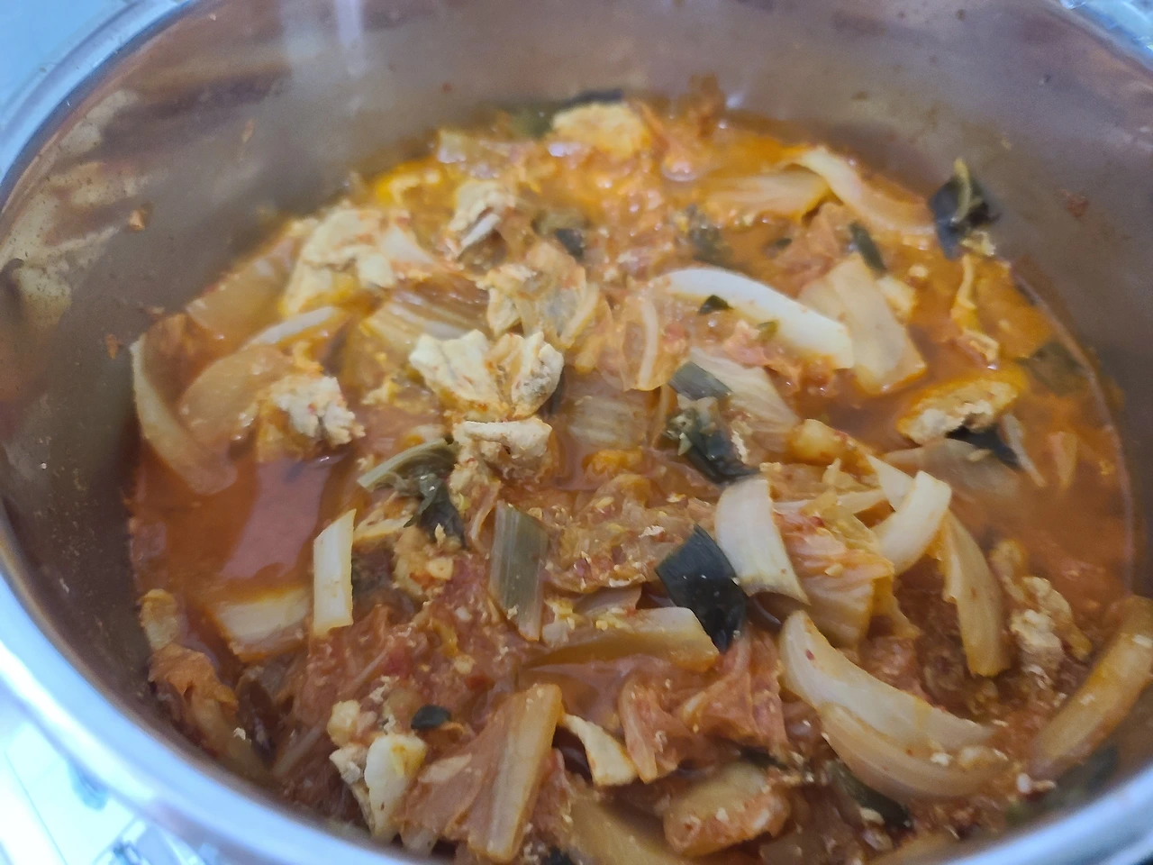 김치는 쉰 김치는 아니지만 듬뿍 넣는다. 고기가 많으니 두 배 이상 넣어준다. 쉰 김치의 신맛을 잡을 필요가 없으니 따로 설탕을 넣지 않는다. 어차피 양파를 넣으면 국이든 찌개든 볶음이든 단맛이 올라온다. 많이 짜게 먹진 않지만 간이 밍밍하고 싱거우면 국간장에 나는 아주 적은 양의 액젓을 추가한다. 소금도 상관없겠지만 국간장은 여러 큰술을 넣어도 금방 잡아주지 못하는 간을 액젓은 반 큰술만 넣어도 끌어올려 주어서 언젠가부터 조금씩 활용해보고 있다.