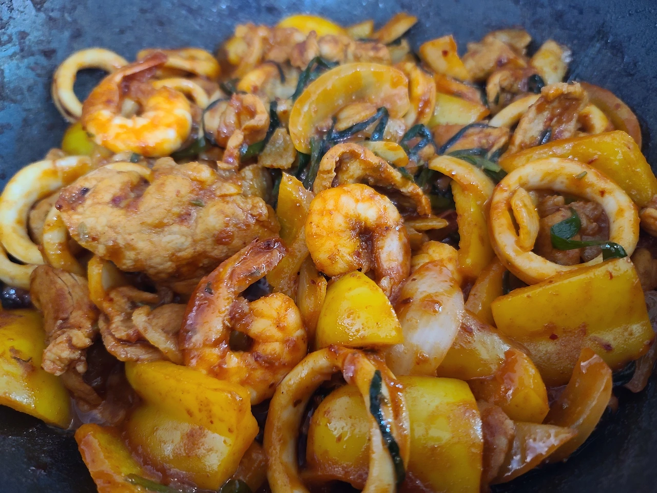 아까 야채 들어가기 전에 냉동실에 있던 냉동새우랑 오징어링이 있어 미리 볶았으니 고기랑 같이 해물볶음도 되는 것이다. 부추 남은 것도 애라 모르겠다 하고 투척.