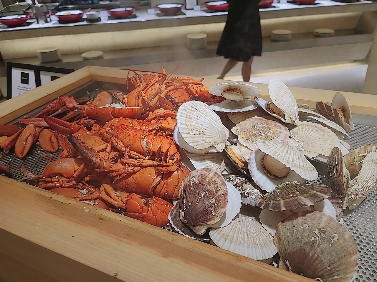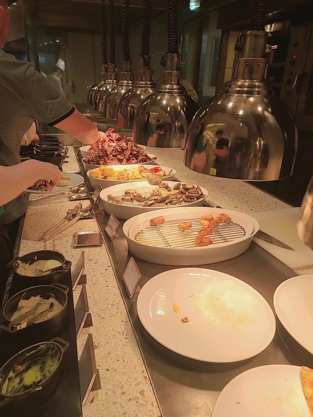사람들이 접시째 가리비와 랍스터를 가져가며 금세 바닥을 보이지만 곧바로 직원이 큰 통으로 가져와 다시 쌓아놓는다. 오픈하고 직후나 붐비지 이후는 여유롭게 가져다 먹을 수 있다. 더 안쪽으로 고기들이 있는데 소시지는 지나가고 뒤로 있는 스테이크와 LA갈비 들도 여러 명의 조리원들이 붙어 구워내기 바빴다.