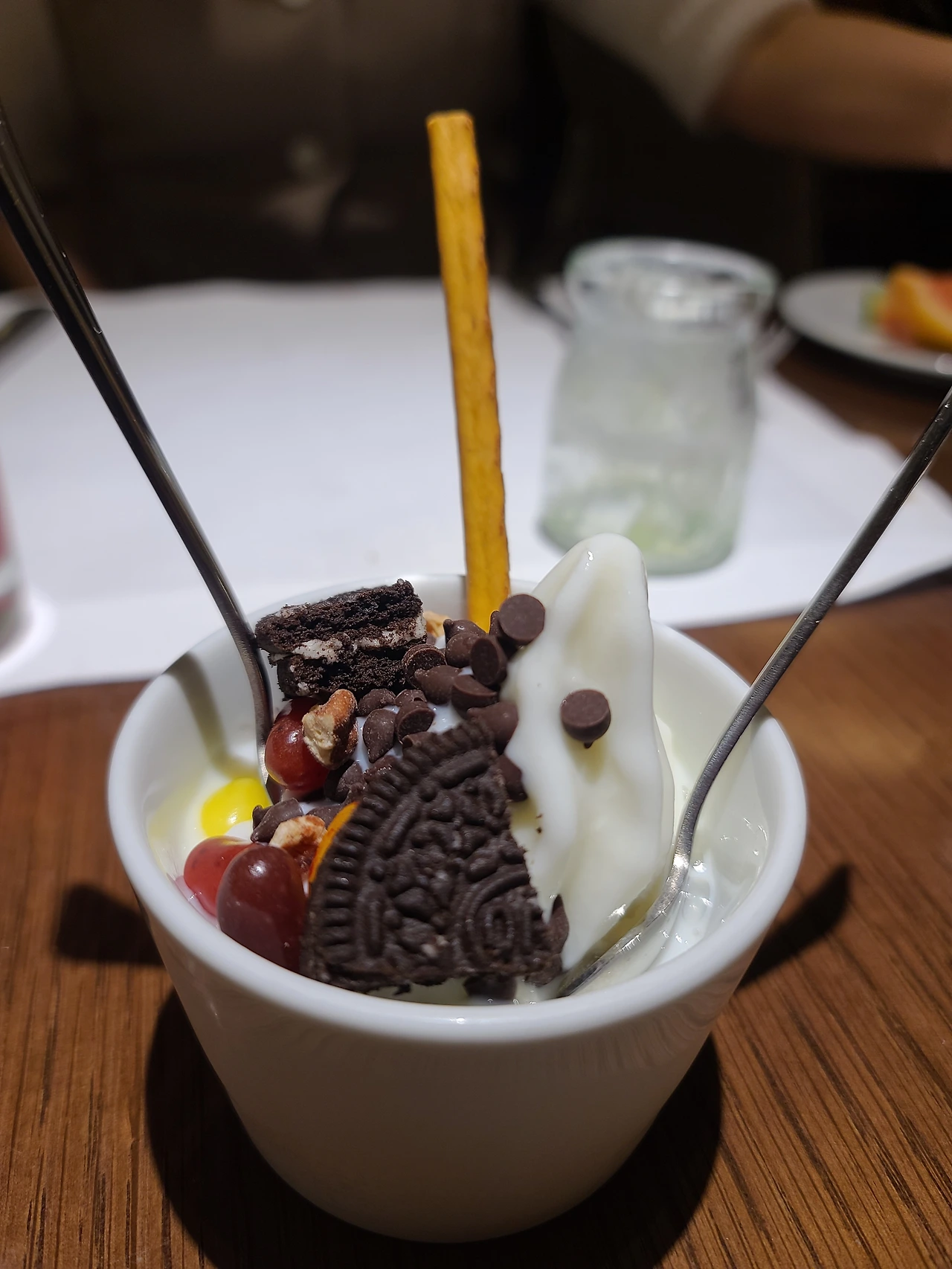 요거트 아이스크림에 쿠키랑 쵸코렛, 젤리까지 토핑을 얹으니 배가 부른데도 맛이 좋다.