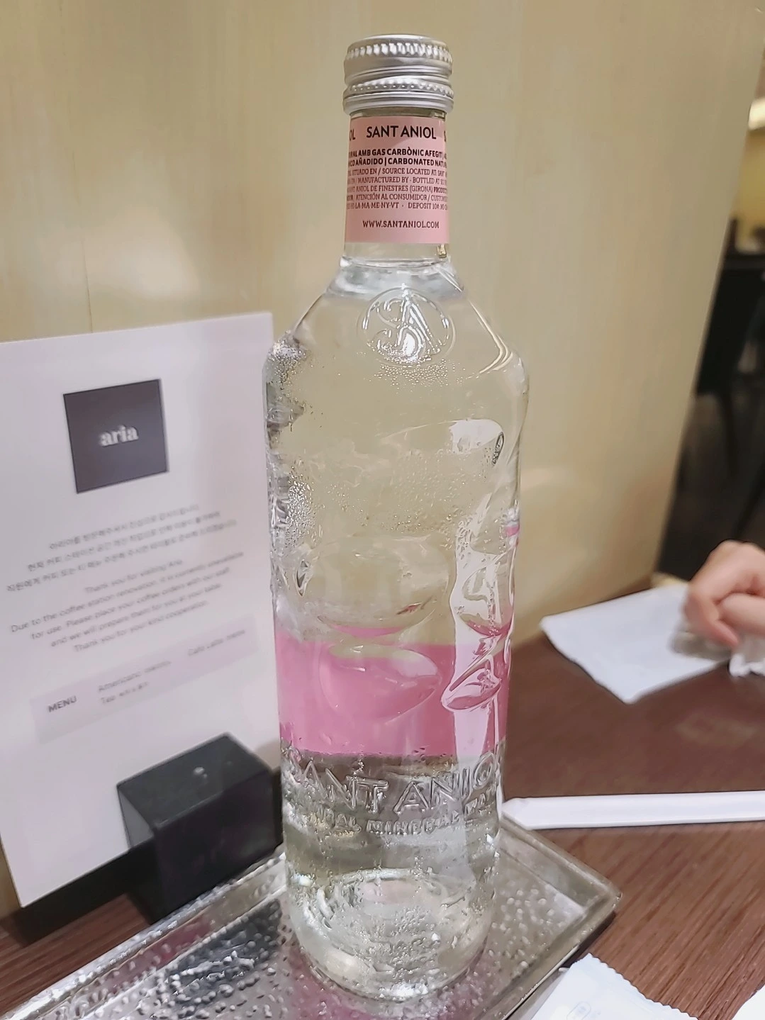 테이블 한편에 커다란 에비앙과 이것이 있었다. 처음 앉았지만 방금 냉장고에서 꺼낸 듯 시원하게 준비되어 있었다. 나중에 다른 리뷰를 잘해놓은 블로그들을 보고 알게 되었는데 이것은 탄산수였다.산트아니올 또는 산타니올 정도로 부른 것 같고 에비앙 1병과 같이 있어 충분히 마시기에 좋다.