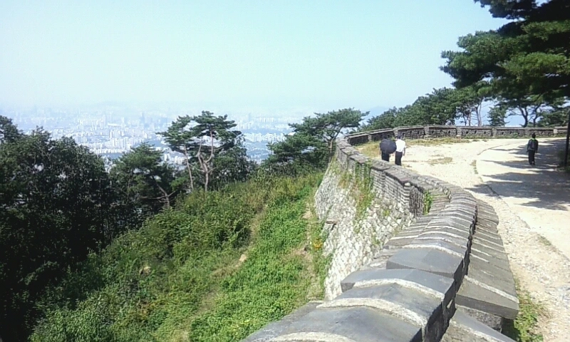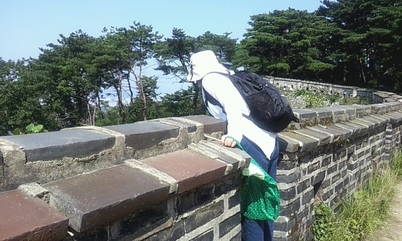 남한산성 산책 중 성곽 아래를 궁금해하는 엄마