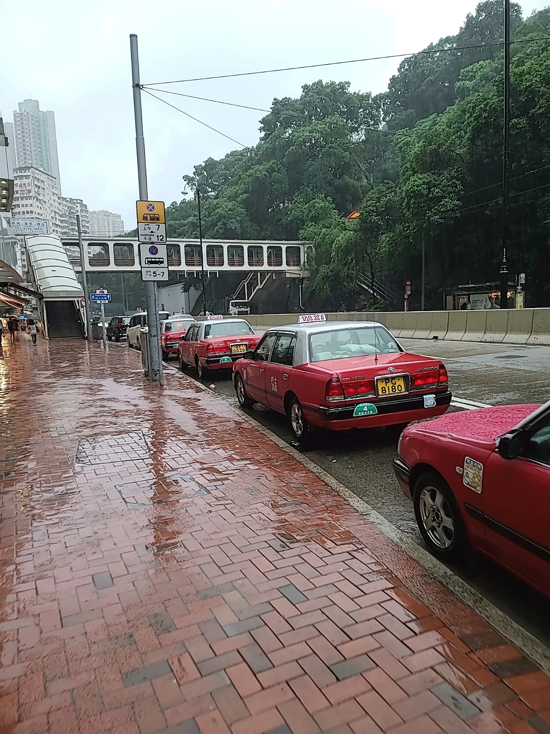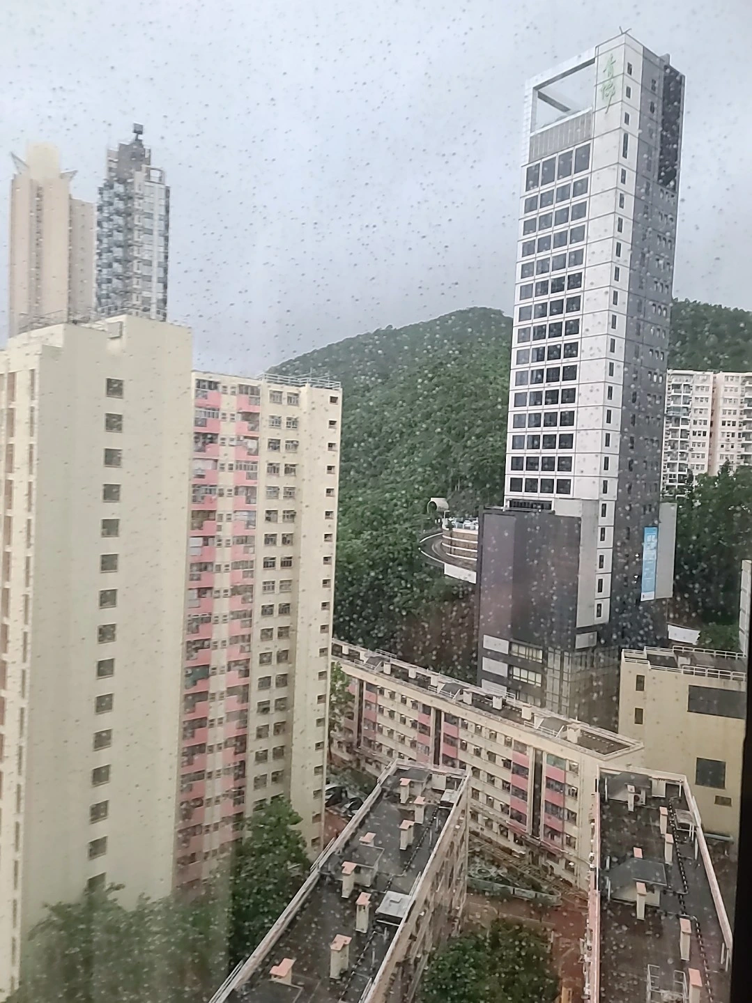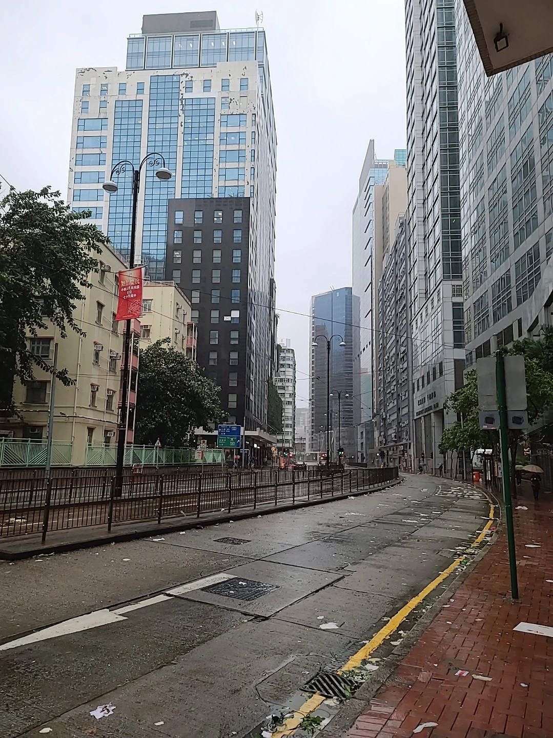 바람에 날린 종이나 쓰레기로 지저분해 보이는 바닥이 보일 정도로 차가 다니지 않는 길이다. 태풍 단계가 낮아져야 교통이 재개될 것으로 보이는데 들려오는 말로는 오후는 돼야 할 것 같다는 것이다. 우리는 이 도로를 따라서 비바람을 뚫고 걸었다. 인구밀도가 높은 홍콩인만큼 건물이 다닥다닥 붙어있고 고층빌딩이 오밀조밀 모여있다.