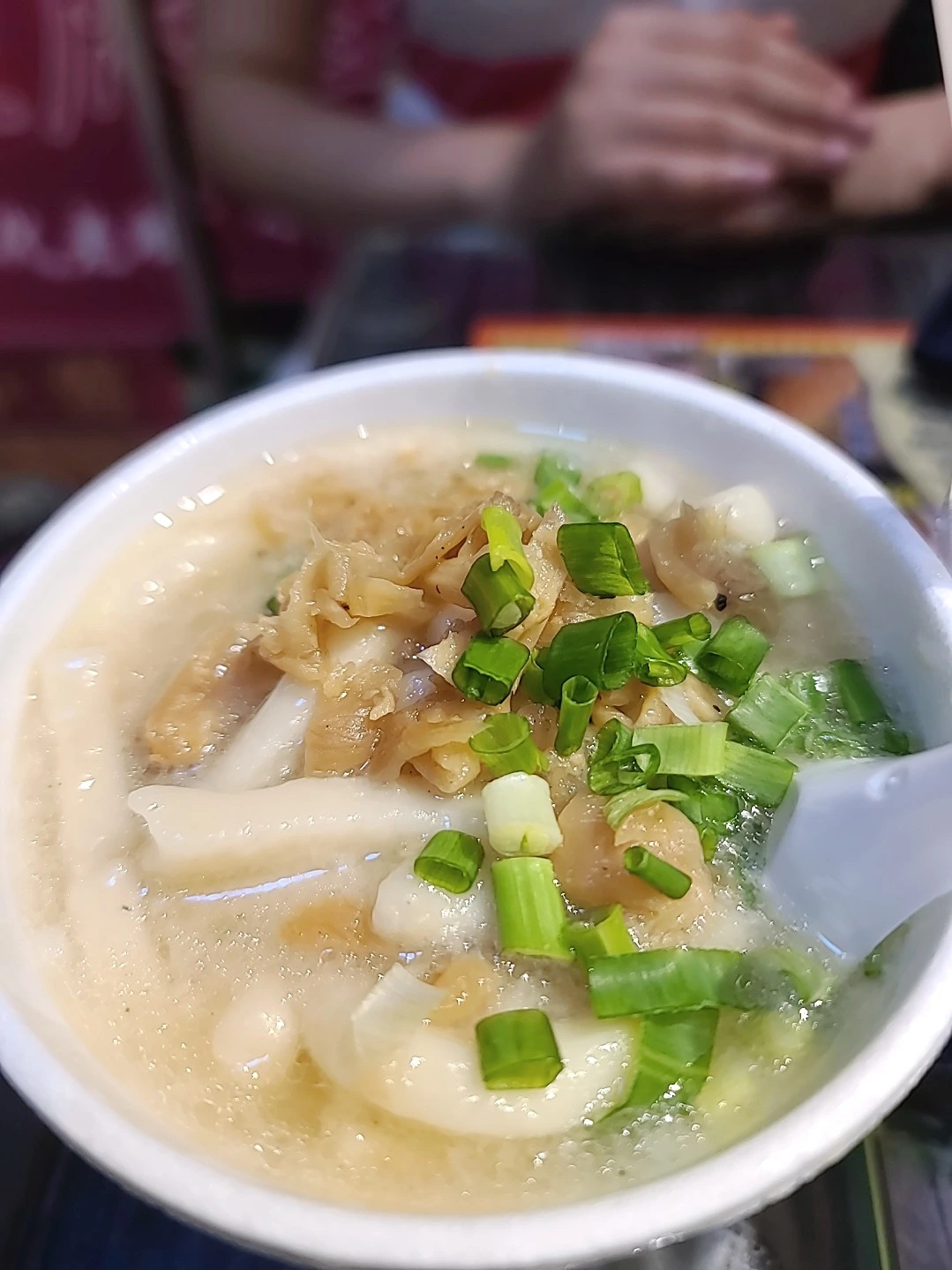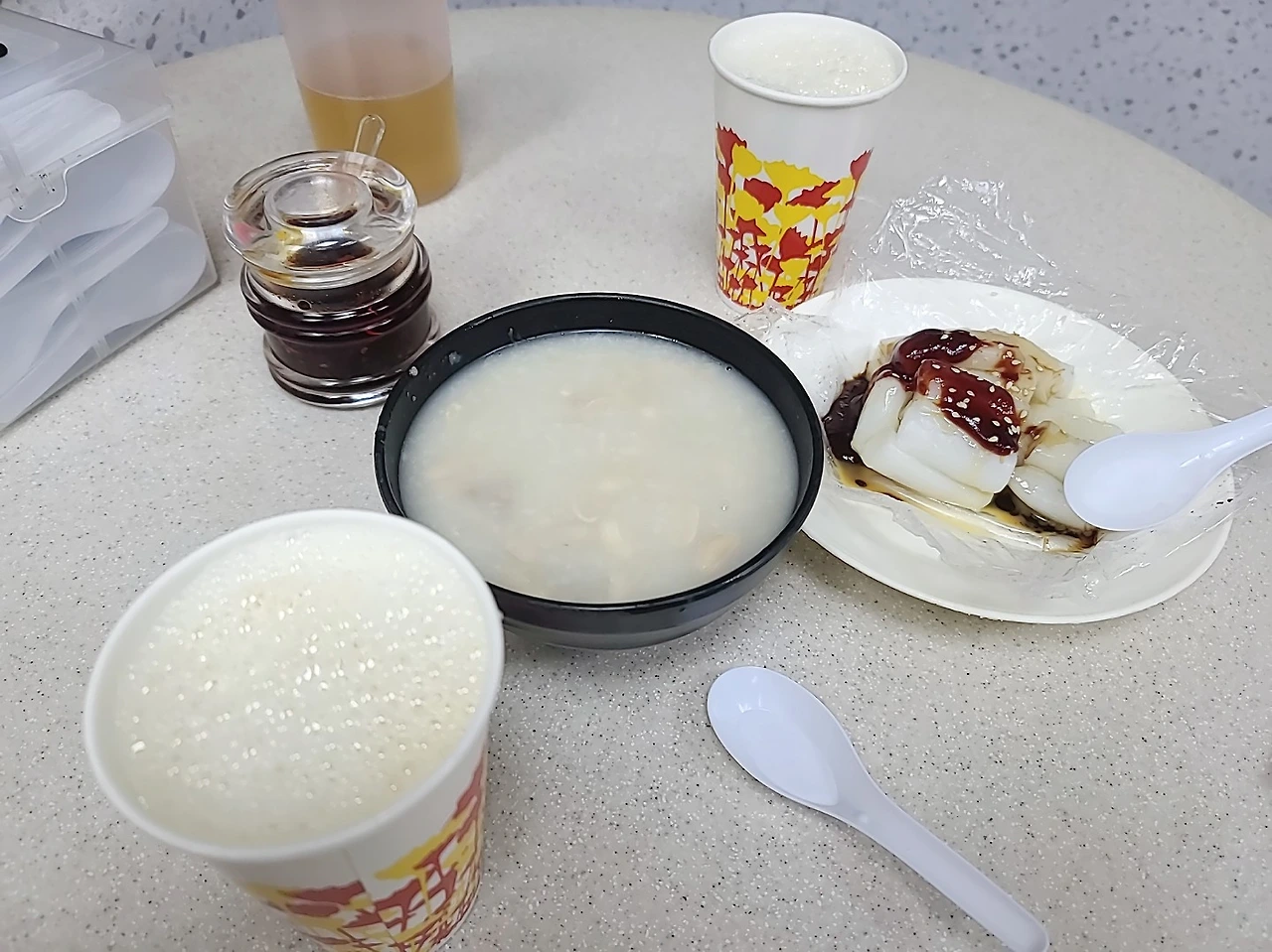 콘지와 창펀, 두유를 시켰다. 메뉴를 주문할 때마다 금방금방 그릇에 턱턱 담아내오시는데 아주 여유로워 보였다. 콘지는 닭죽 느낌에 고기가 조금 붙은 작은 갈빗대가 들어있었다. 커다란 콩도 들어있는데 짭짤하게 간도 돼있어서 아주 친근한 맛이다. 다 먹고 나면 속이 든든하다. 사진 맨 우측으로 창펀인데 라이스롤이라 생각하면 된다. 우리 떡볶이 같은 느낌일 줄 알았는데 생각보다 엄청 탱글 쫄깃한 것이 표현하기 어려운데 묵과 떡의 중간느낌이랄까. 이것을 소스에 묻혀 먹으니 엄청 맛이 있다. 소스는 맵거나 짜지 않은 달큼한 느낌인데 우리나라에서는 맛볼 수 없는 종류이다. 검색해 보면 큰 딤섬집들도 창펀이라고 라이스롤에다가 속재료로 새우나 다른 것들도 넣은 메뉴들이 식당마다 있는 것 같다.사진을 보면 특별할 것 없고 유명 식당들 리뷰해 놓은 콘지보다 부실해 보일 수 있지만 안 좋은 날씩에 현지느낌 제대로 살리면서 맛있는 아침 식사를 착한 가격에 즐긴 것에 매우 만족스러웠다.