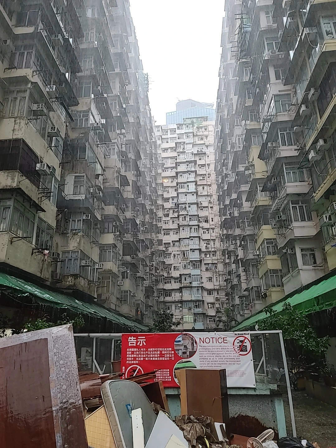 건물 사이가 좁고 높게 지어진 오래된 아파트이다. 세대 수도 많을 텐데 안은 볼 수 없으니 모르지만 그리 큰 평수는 아닐 것 같다. 이러한 아파트나 건물은 많이 볼 수 있긴 한데 익청빌딩은 아마도 과거에 트랜스포머 촬영지여서 사람들이 그나마 찾는 것 같다. 날씨가 좋지 않아서 더더욱 우울하게 보이고 마침 사진 찍는 곳 바로 앞에 저렇게 쓰레기들이 쌓여있어서 더 안 좋게 보인다. 현수막에는 이곳을 지나쳐 안으로 출입하지 말라는 것과사생활 침해가 될 수 있는 드론 등 사진촬영을 금한다는 것이다. 관광객들이 건물 안 까지 들어와 현지인들에게 꽤나 스트레스를 주었나 보다. 창문도 그냥 열려있는 집들이 많았는데 태풍까진 아니어도 비 올 때 이곳을 방문했던 다른 사람들이 블로그에 썼던 것처럼 저렇게 두면 이불이 마를까 하는 의문이 들었다.