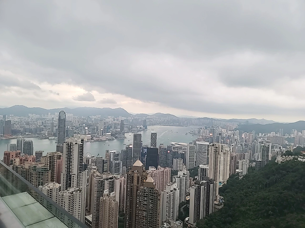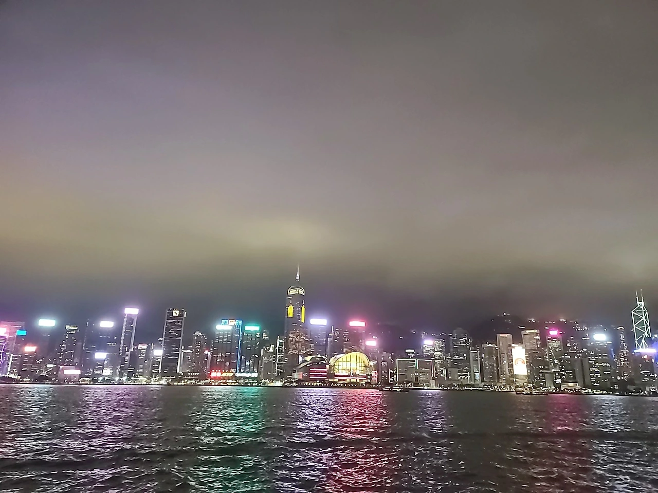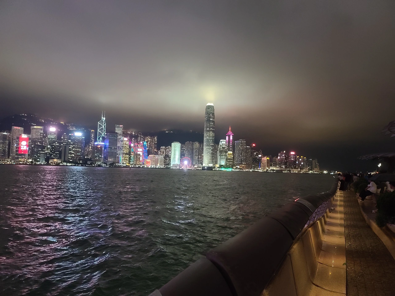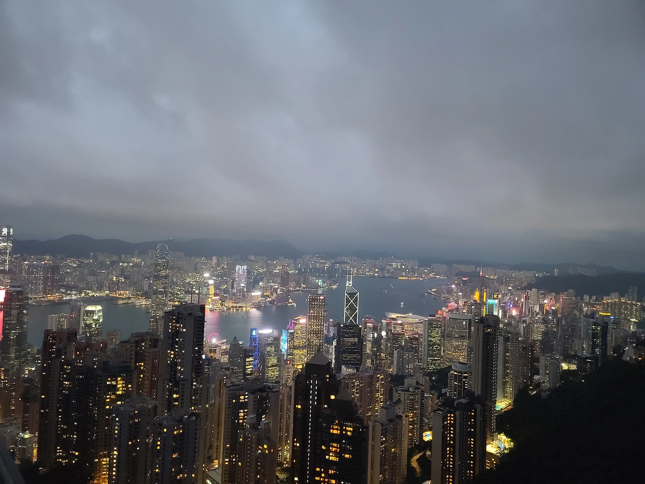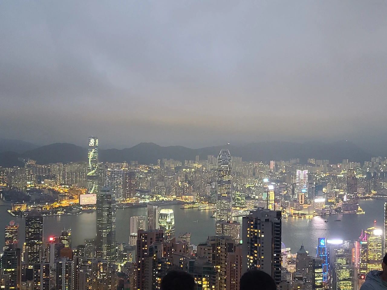 시간이 흘러 해가 지면서 점점 어두워지고 아직 날이 흐려 구름은 있지만 야경을 보기에 충분하다. 바람도 불고 홍콩 답지 않게 비 온 뒤라 기다리는 내내 쌀쌀했지만 밤에 보는 홍콩의 야경은 정말 멋지고 보람 있었다. 멀리 침사추이 스타의 거리에서 보던 것과 또 다른 매력이 있다.