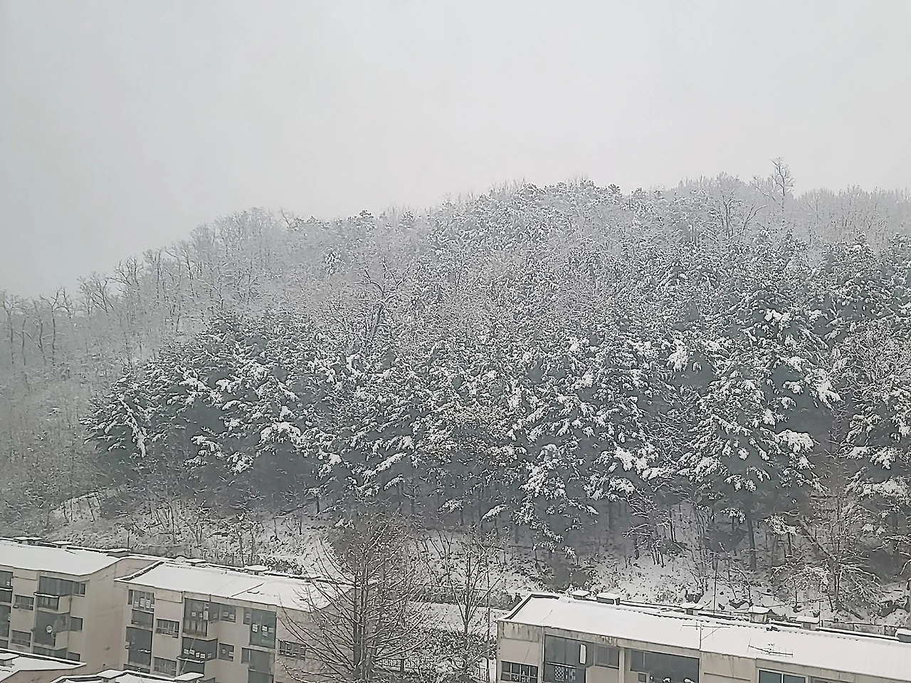 집 앞에 근처에 보이는 놀이터도 수북이 눈이 쌓여 리모델링되어 있다. 아직 발자국이 보이지 않는데 아마 하루가 지나면 아이와 부모들의 발자국이 뒤엉켜 찍혀있을 것 같다. 내가 사는 곳이라도 저런 곳은 이제 일부러 먼저 지나가지 않는다. 처음 발도장을 찍으며 기뻐할 아이나 커플들을 위해 남겨두는 나의 배려이다. 뒷 산에 나무들에도 눈이 쌓여간다. 크리스마스가 지나도록 트리하나 놓지 않은 우리 집이지만 저렇게 트리숲을 보게 되니 위안이 된다.