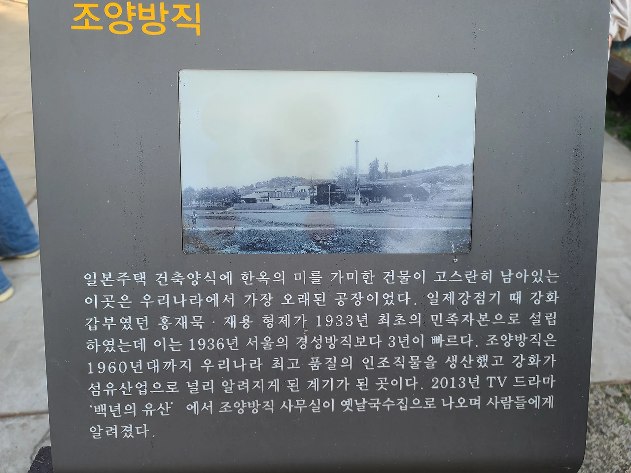 여행이라 하면 먹는 것이 빠질 수 없는데 예전부터 가끔씩 잊을만하면, 그리고 강화도를 검색하다 보면 뜨는 곳 중 하나가 바로 조양방직이다. 요즘 교외에도 대형카페나 베이커리카페가 좋은 곳이 많이 생겨서 갈 곳이 많아졌다. 그렇다고 다 가볼 수도 없고 갔던 후기를 보면 그저 다른 사람들의 리뷰에서 보이는 것이 전부라거나 생각보다 작아서 기대이하였다는 평도 많이 보게 된다. 조양방직을 찾아보면 그냥 '갤러리카페' 정도로 나오고 규모는 있지만 그저 잘 조성된 큰 카페인가 보다 하고 크게 관심이 더 가거나 기대되진 않았었다. 그런데 직접 방문하고 어떤 곳인지 알아보니 다르게 느껴졌다. 어떤 곳인지는 조양방직 안의 정원에 설명이 쓰여있는 안내판을 통해 쉽게 알 수 있었다.