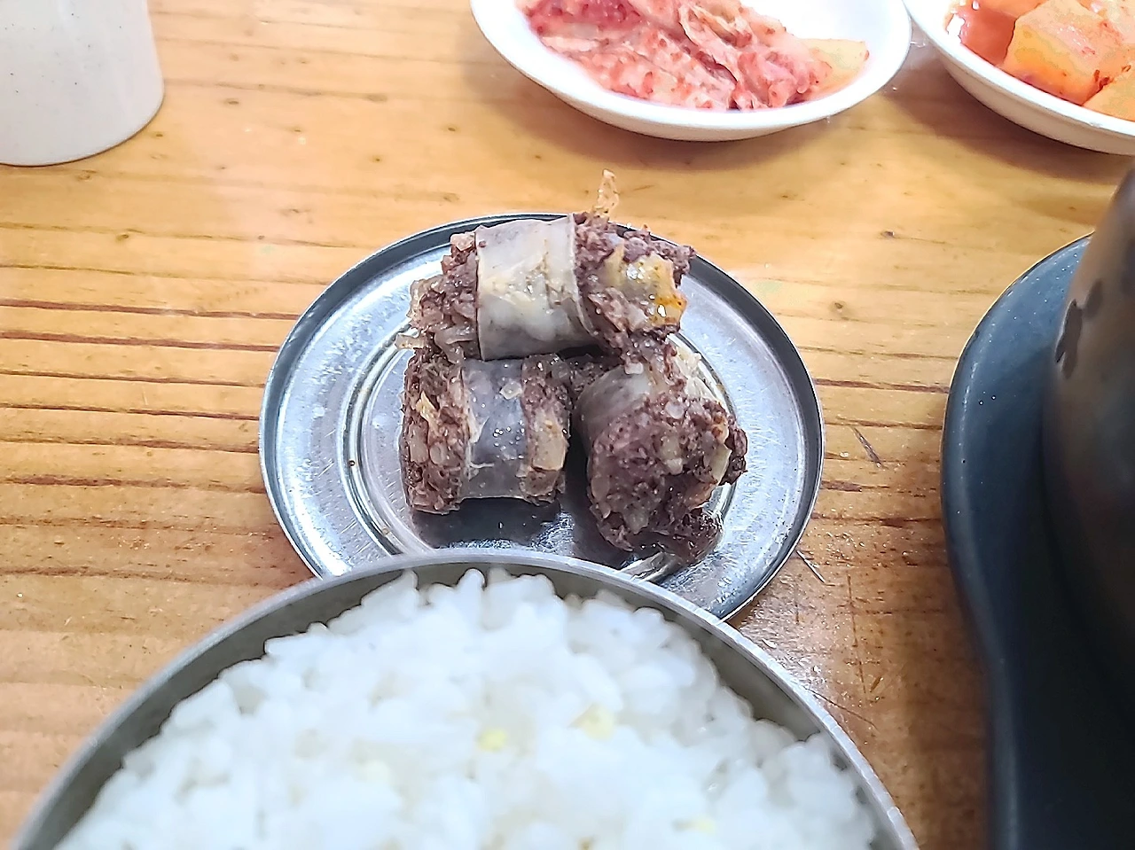 국밥은 보통 재료를 담고 펄펄 끓는 뚝배기채로 나온다. 처음에 바로 먹으면 매우 뜨거워서 내가 먹는 게 건더기인지 내 입인지 알 수 없을지도 모른다. 특히 다른 재료들도 그렇겠지만 유독 순대는 더 뜨겁다. 통통한 순대는 속재료가 꽉 차있는데 그것이 뜨거운 국물까지 머금고 있으면 입안을 데기가 아주 딱이다. 조심성 없이 달려들었다가는 지옥을 맛볼 수 있다. 많이 먹다 보니 드는 생각이 한쪽에 빼서 식히면 다른 것들은 적당히 식어갈 때 중간에 먹기 알맞겠다는 생각이 들었다. 그때부터 국밥이 나오면 똑같이 하는 세리머니인 순대 빼서 쌓아놓기가 시작되었다,