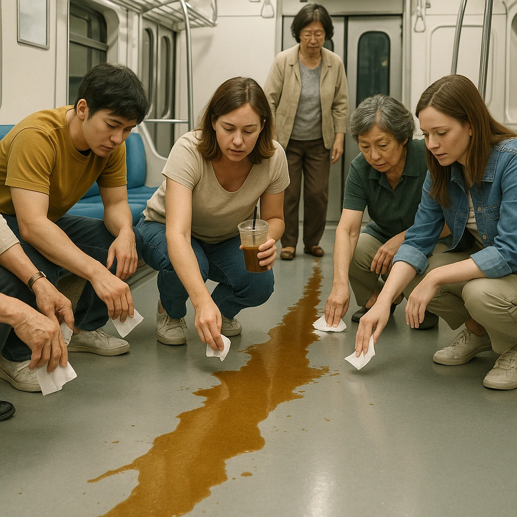 객실의 거의 절반 길이로 긴 커피물이 흘렀고 멈춰있던 커피를 흘린 여성분이 어디서 구했는지 작은 휴지로 감당도 되지 않을 양의 커피를 닦기 시작했다. 주변 사람들의 시선이 따갑게 느껴지기도 할 테고 민망할 수도 있는 자리이다. 이미 길어진 커피물의 꼬리는 눈에 잘 띄어 새로운 역에서 정차할 때마다 새로 승차하는 사람들에게 거슬리는 광경이 되었다. 그래도 그 따가운 시선과 당혹스러움, 그리고 뒤처리에 대한 스트레스를 뒤로하고 휴지로 닦기 시작한 것이다. 닦고 있어도 티가 거의 나지도 않고 사람들이 계속 오가고 있어서 전부 처리하기도 쉽지 않아 보여 보는 이들로 하여금 한숨도 나오고 안타깝게 만드는 광경이었다. 그런데 놀라운 광경이 펼쳐진다. 커피를 흘린 여성이 바닥의 커피를 닦기 시작한 지 얼마 지나지 않아 하나둘씩 주변 사람들이 움직이기 시작했다. 어디서부터 시작이었는지 모르게 얼마 되지 않아 여기저기 제각기 갖고 있는 종이나 휴지들을 꺼내어 바닥에 웅크려 앉아 커피를 닦기 시작했다. 누가 시키지도 않고 부탁해서도 아니었다. 멀리 객실 가장 뒷 편의 노약자석에 앉아 계시던 어른들께서도 손을 돕기 시작했다.