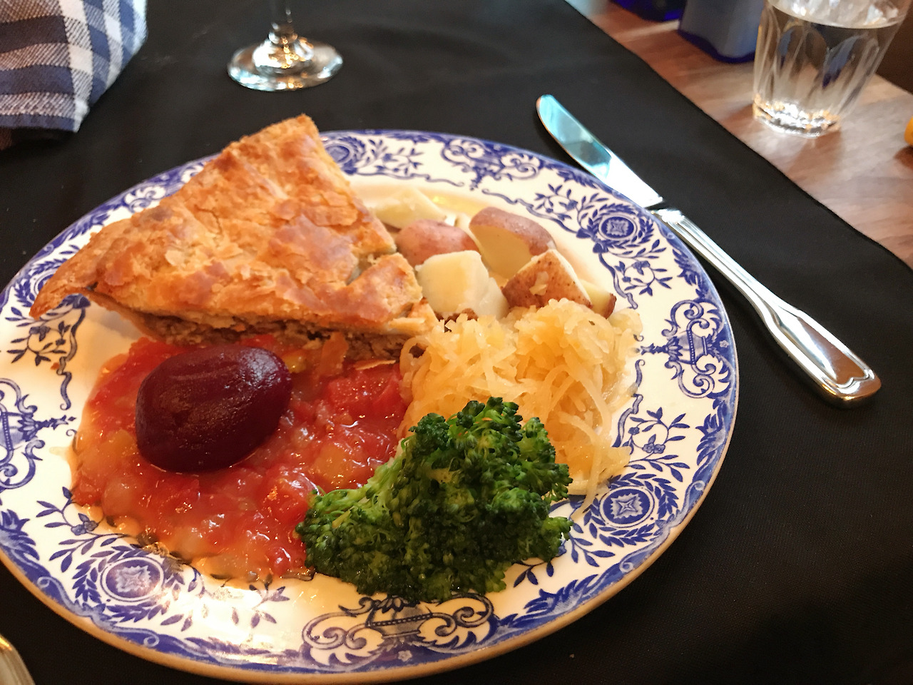 메인으로는 퀘벡 전통요리인 미트파이가 나왔다. 메이플소스가 잔뜩 들어간 매우 달콤한 소스에 고기파이를 찍어 먹었다. 의외로 어울렸다. 소스없이는 미트파이가 느끼하게 느껴졌다.