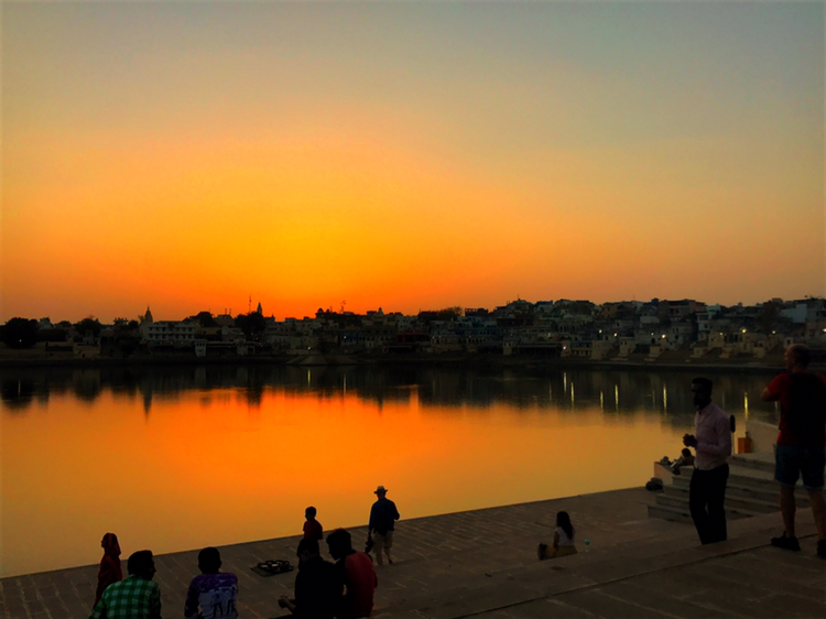 가트에 앉아 멍하니 시간을 보내니 어느새 일몰. 푸쉬카르는 고아, 마날리와 함께 인도에서 히피들의 3대 성지라고 불린다. 일몰이 색칠하는 가트에서 그들은 가진 각자의 장기(곤봉, 훌라후프, 저글링 등)를 연습하고 노랫소리로 호숫가를 가득 채운다. 정신이 하나도 없지만 꽤나 즐거운 분위기다.