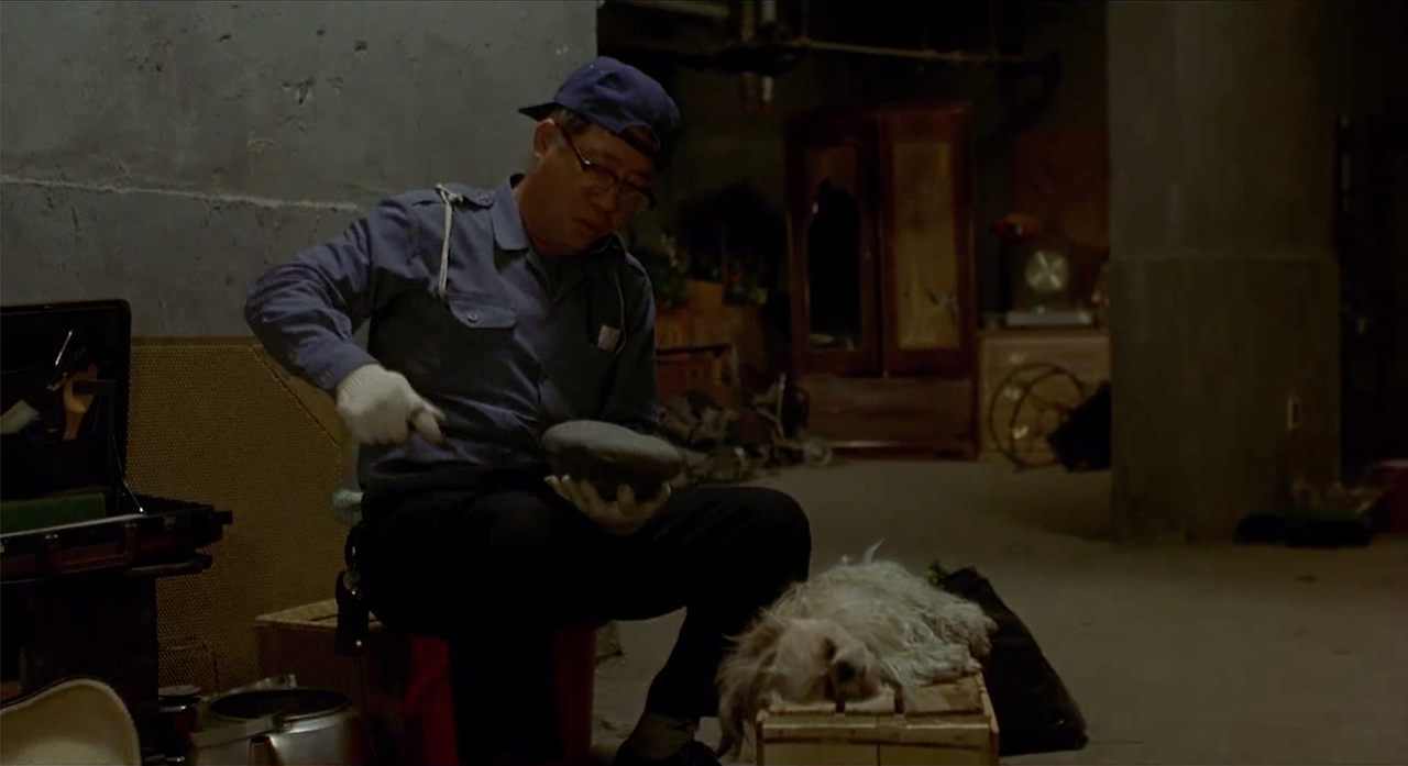 영화에는 이렇게 운명이 갈린 삔돌이, 아가, 순자가 나온다. 세 마리 개의 견생(?)은 다 다르지만 개들은 윤주를 움직이고 이동하게 하는 장치로 활용되어 이야기를 전개하는 데 아주 중요한 역할을 한다. 윤주의 집에서 출발한 영화는 개를 납치하고, 죽이고, 산책시키고, 찾아다니는 윤주의 동선을 따라서 아파트 옥상과 지하로, 단지의 길과 공원으로 관객을 데려간다. 그렇게 감독은 영화의 공간을 위아래로, 또 옆으로 늘리며 복도식 아파트의 수직과 수평 이미지를 마음껏 활용한다. 그리고 윤주가 지나다니는 공간으로 할머니, 변경비, 부랑자 최 씨가 모습을 드러낸다. 이들은 윤주와 같은 아파트에 있지만 지나쳐 버리거나 마주칠 기회도 없었을, 서로의 존재조차 모르던 사람들이다. 섞일 수 없는 이질적인 것을 한 화면에 담는 것을 좋아한다는 봉준호는 이렇게 다양한 사람들을 한 곳에 모이게 하는 장치로 개를 활용한다. 마치 <기생충>에서 기우(최우식 분)의 ‘과외’가 절대 만날 수 없는 기택(송강호 분)네와 박사장(이선균 분)네를 만나게 하는 시작점으로서 기능하듯이 말이다.