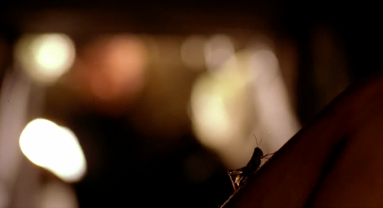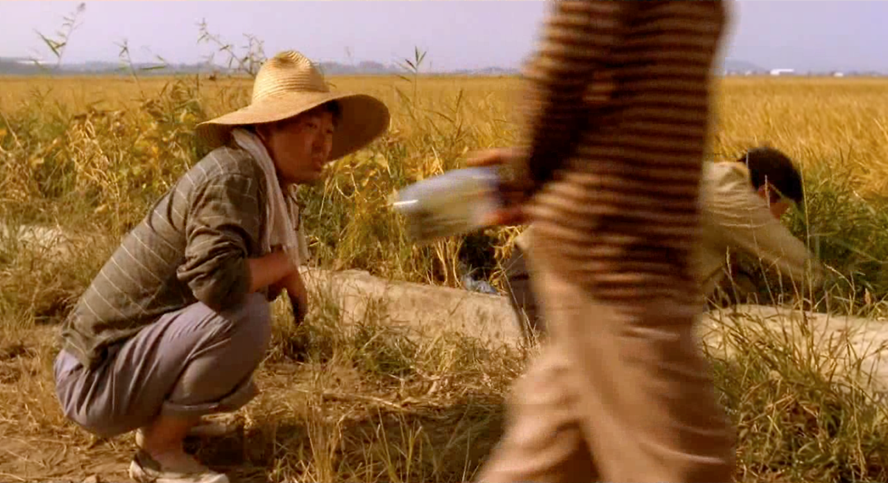 남자애가 벼에 앉아 있는 방아깨비 한 마리를 잡는다. 남자애는 누군가 오고 있는 것을 알고 주위를 한번 둘러본다. 경운기에서 내린 두만이 자기 쪽으로 다가오자 남자애는 손에 든 유리병을 몸 뒤로 숨긴다. 유리병 안에는 아까 잡은 방아깨비 같은 곤충들이 여럿 들어 있다. 두만을 데려 온 농부(신동환 분)가 남자애에게 “저리 가”라고 여러 번 말하지만 남자애는 그 자리를 떠나지 않는다. 배수로 안으로 들어간 두만이 깨진 거울 조각을 주우려고 잠시 몸을 일으키는 사이, 남자애는 손에 든 유리병을 쨍그렁 흔들며 두만 옆을 유유히 지나간다. 두만은 그 유리병을 보지 못한다. 두만이 거울로 배수로 안을 비추자 손과 입이 꽁꽁 묶인 시체가 보이고 그 위에 메뚜기 한 마리가 앉아 있다. 그런데 어느 순간부터, 남자애 손에 들려 있던 유리병이 보이지 않는다.
