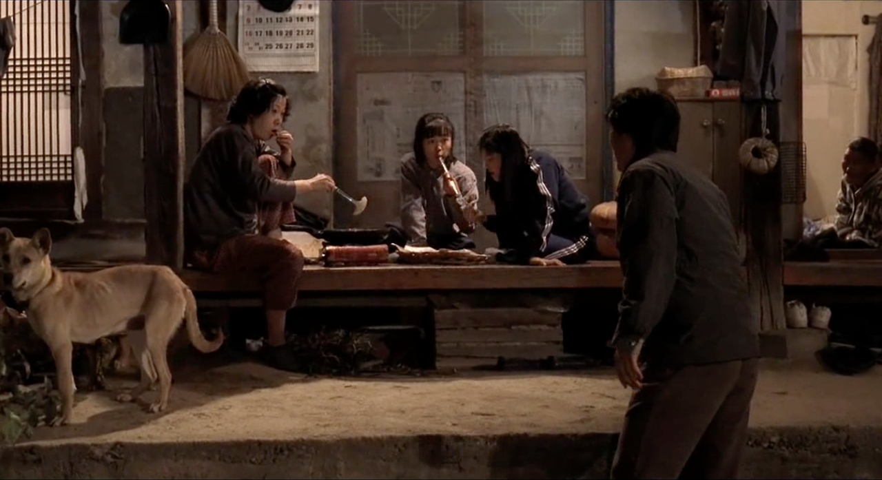 소현네 집은 개를 키우고 있다. 이 상황에서 정작 ‘이상한 사람’은 태윤이고, 이 장면에서 ‘이상한 태윤’보다 더 이상한 건 짖지 않는 개다. 시골 개들은 보통 낯선 사람이 나타나면 쉬지 않고 짖어댄다. 그런데 태윤이 갑자기 문을 열고 들어왔는데도 왜 개가 짖지 않았을까? 우선 드는 생각은, 인물들의 대사가 중요했기 때문에 동시녹음에서 개 짖는 소리가 겹치지 않아야 했을 것이다. 이렇게 기술적인 이유로 시골 개가 짖는 자연스러운 모습을 연출하지 못할 거라면 아예 화면에서 개를 빼면 되지 굳이 개를 넣은 이유는 뭘까? 사실, 이 화면에서 없어도 되는 건 개뿐만이 아니다. 눈을 오른쪽으로 돌리면 방 안에 할머니 -화면상으로 성별 구분이 조금 어려운데 할머니로 추정한다- 한 분이 앉아 있는데 대사 한 마디 없는 것은 물론이고 거의 가만히 앉아 계신다. (최선의 연기를 하신 거겠지만 조연들까지 나오는 크레디트에서조차 이름을 찾지 못했다.) 감독이 원하는 대로 연기할 수 없는 개와 어떤 연기도 하지 않는 것 같은 할머니를 한 화면에 넣은 것은 감독이 당시 시골집의 저녁 풍경을 한눈에 보여 주려고 했기 때문일 것이다. 마루에서 전을 부쳐 먹는 엄마와 딸, 친구 집에 놀러 온 아이, 거기에 개와 노인까지 한 자리에 모여 있어야 비로소 대문을 열고 들어서면 펼쳐지는 80년대 시골집의 앞모습이 완성되기 때문이다.