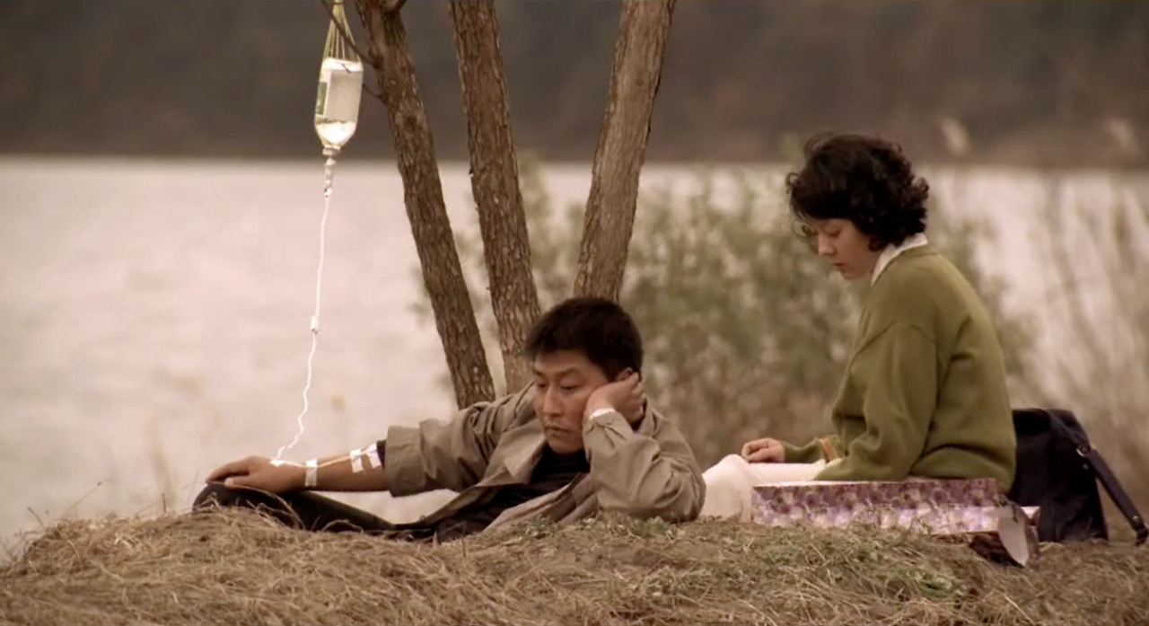 유리병은 어디에 있을까? 공기가 통하지 않는 꽉 막힌 뚜껑, 뜨거운 태양이 달구는 유리병 속에서 곤충들은 서서히 죽어갔을 것이다. 남자애가 잡은 방아깨비는 알을 밴 듯 몸이 부풀어 있는 것으로 보아 산란기를 앞둔 왕치(방아깨비의 암컷)로 추정된다. 왕치에게서 공포 속에서 떨었을 여자들이 겹치는 건 우연이 아니다. 감독은 너무나 쉽게 왕치를 잡는 남자애를 통해 제대로 저항도 하지 못하고 삶을 마감한 희생자와 살인자 사이의 힘의 불균형을 보여 준다. 두만이 배수로 밑을 볼 때, 카메라는 초점을 메뚜기에서 두만으로 옮기는데 감독은 곤충의 실루엣을 보여 줌으로써 ‘곤충=희생자’라는 의미를 이미지로 재차 확인시켜 준다. 다시, 유리병은 어디에 있을까? 만약 다른 누가 그 유리병을 발견한다고 해도 이 남자애가 한 짓이라는 걸 바로 알아낼 수 있을까? 범인은 살인을 숨기고, 형사는 눈앞의 범인을 알아보지 못한다. 그렇게 살인은 범인에게만 ‘추억’이 된다. (오프닝 씬의 남자애에게 이름을 지어주지 않은 것도 의미심장하다. 엔딩 씬의 여자애도 이름이 없다.)