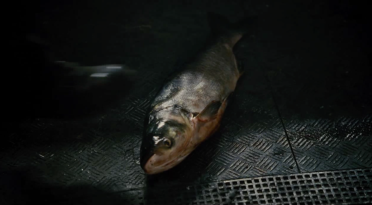 이 영화에서 실제 물고기가 등장하는 아주 중요한 장면이 있다. 커티스 일행이 자신들을 막아서는 진압군과 싸우는 칸에서다. 문을 열자 복면으로 얼굴을 가린 진압군이 나타나고 뒤쪽에서 물고기 한 마리가 앞으로 전달된다. 진압군 하나가 도끼로 물고기의 배를 갈라 동료에게 넘기고, 동료는 물고기 뱃속에 도끼를 넣어 피를 묻힌다. 굉장히 상징적인 이 컷에 대해 감독은 ‘이제 너네들 다 죽었다, 피의 축제가 시작된다.’라는 일종의 의식 같은 거라고 말했다. 그런데 왜 물고기일까? 만약 물고기가 아닌 비슷한 크기의 다른 동물로 바꿔 본다면...? 소리를 지르고 몸을 떨고 있을, 그 모습을 떠올리는 것만으로도 끔찍하다. 하지만 물고기는 그렇지 않다. 곤충을 제외하고, 물고기는 인간이 가장 약한 힘으로 죽일 수 있는 동물이다. 우리는 살아있는 문어를 끓는 물에 집어넣고, 잡은 물고기를 바로 회를 떠서 먹는 데 아무 거리낌이 없다. 그것이 가능한 건 물고기들이 죽을 때 울지 않기 때문이다. 그들은 죽어가면서도 아무 표정도 짓지 않는다. 감독은 이 장면에서 현장의 소리를 모두 제거하고 오직 생명을 죽이는 시각적 효과, 죽음에 대한 경고만 남긴다.