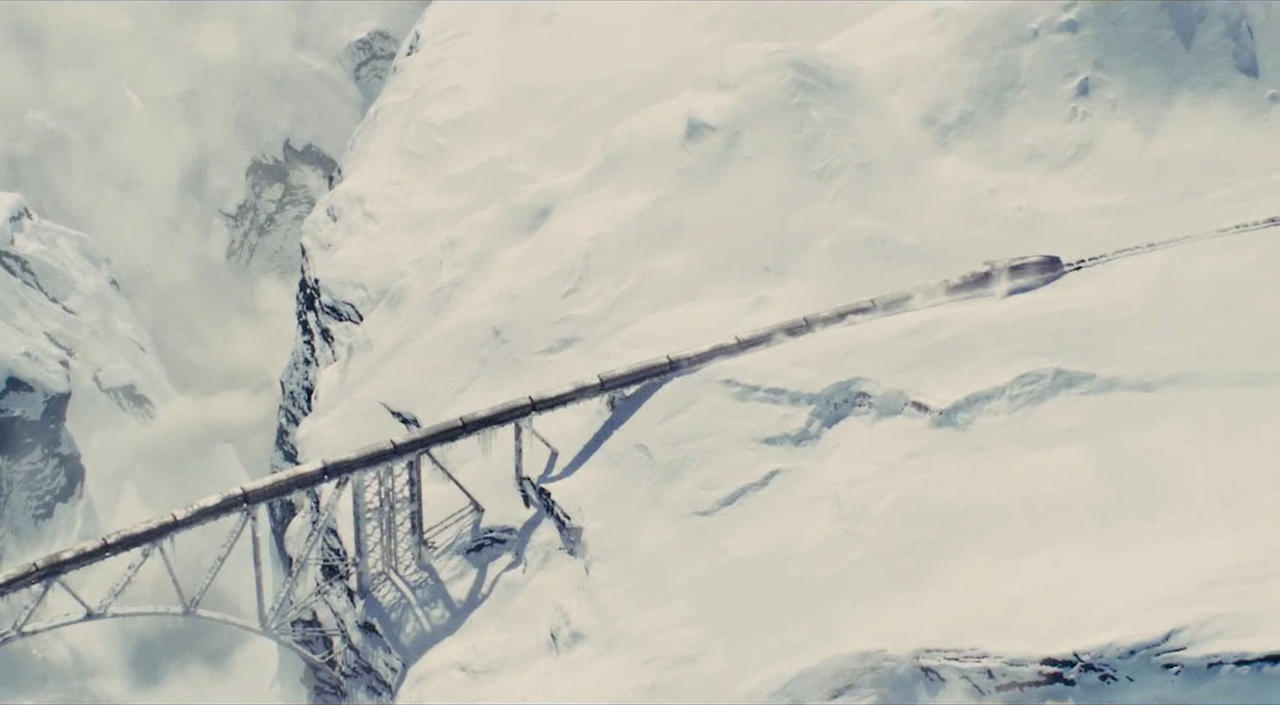 지구는 온통 하얀 눈으로 덮여 버렸다. <설국열차>의 오프닝 씬에서 지구온난화를 막기 위해 냉각제인 CW-7을 뿌릴 거라는 아나운서의 멘트와 함께 비행기가 CW-7을 살포하는 장면이 나온다. ‘CW-7의 대량 살포 직후, 거대한 한파가 세계를 덮쳤다. 새로운 빙하기, 지구 상의 모든 생명체는 멸종되었다.’라는 자막이 이어지고 한 줄기 빛이 펜던트의 ‘Save the Planet’이라는 글자를 비춘다. 인간은 자연을 파괴했고 그것은 인간에게 재해로 돌아왔다. 인간은 자연의 위협을 피할 수 있는 안전한 공간(설국열차)을 만들어 그곳에서만 살아간다. 모든 것이 다 얼어 붙지는 않았다는 걸 증명하려는 듯 열차는 아슬아슬하게 외길을 달리고 있다. 열차는 멈추지 않고, 멈추면 안 된다. 왜 멈추면 안 되는지, 그 누구도 묻지 않는다.