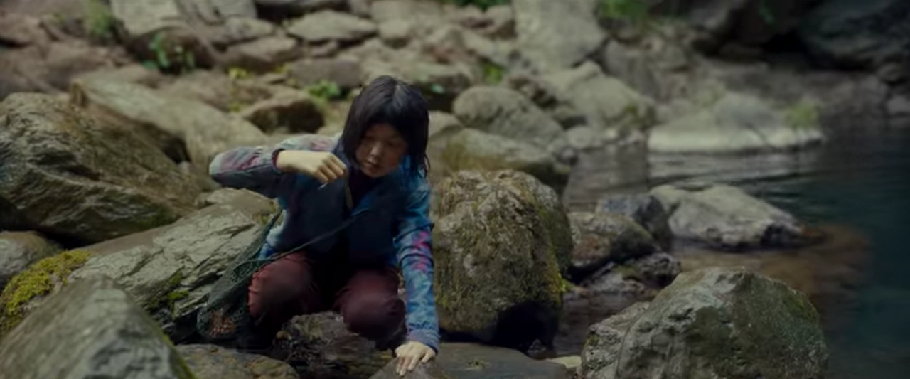 <옥자>의 산골 장면은 도시에서 태어난 요즘 아이들에게는 지구 반대편의 뉴욕보다 낯선 풍경이다. 민들레 홀씨를 불고 있는 미자와 지게를 매고 땔감을 구해 오는 희봉(변희봉 분)이 무척 신기해 보일 것이다. 와이파이는 있을까? 다행히(?) 고장난 텔레비전은 나온다. 요즘 시골에서도 거의 보기 힘든 옛날 시골의 모습은 도시와 극명한 대비를 이룬다. 그중에서도 미자가 고기를 얻는 방법은 도시에서는 절대로 할 수도, 볼 수도 없다. 미자가 옥자에게 매운탕을 먹고 싶다고 하자 옥자가 물웅덩이에 뛰어들어 물고기들을 물 밖으로 튀어 오르게 한다. 미자는 물고기를 잡아 그물망에 넣는다. 봉준호는 미자가 물고기를 직접 잡는 모습을 보여 주며 우리가 먹는 생선이 마트에 진열된 상품이기 전에 생명이라는 것을 보여 준다. 아울러 인간이 생존하기 위해 어쩔 수 없이, 또 먹고 싶은 마음에 물고기를 잡아먹더라도 자연생태계를 무너뜨리지 않는 범위에서의 살생은 문제가 되지 않는다고 말한다. 과거의 인류는 음식의 생산과 소비 과정을 목격하고 경험했다. 1980-90년대까지만 해도 시골에서는 잔치 같은 특별한 날이면 마을 어른들이 모여 직접 닭, 돼지, 소, 개를 잡아먹었다. 하지만 도시에서는, 언제 어디에서나 고기를 먹고 있지만 동물을 직접 죽이지는 않는다. 점점 더 많은 사람들이 도시에서 살게 되면서 우리는 이 과정에서 멀어져 버렸다.
