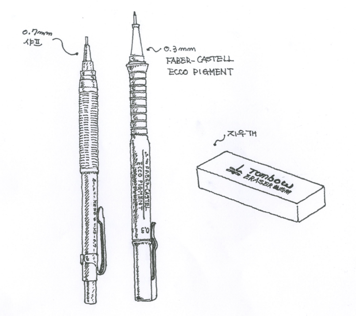 나의 드로잉을 가능하게 해 주는 친구들이 있다. 종이, 연필, 펜, 색연필, 종이. 그들이다. 종이는 면이 거칠지 않은 판화용지를 주로 사용한다. 종이위에 0.7mm의 샤프 펜슬로 밑그림을 그리고 그 위에 0.3mm의 펜으로 본 그림을 그린다. 펜은 잉크가 시간이 흘러도 변색되지 않는 수성펜을 사용하는데 얼마 전까지는 독일산 STAEDLER 사에서 나온 pigment liner를 사용해 왔다. 그러나 최근에는 가장 내구성이 있다는 ‘인디안 잉크’가 주입된 FABER CASTEL 사에서 나온 ecco pigment 펜을 사용하고 있다. 펜으로 대부분의 그림이 완성된 이후에는 색연필로 컬러링을 한다. 색연필은 FABER CASTEL 사의 120색을 사용하고 있다. 비교적 많은 색을 가지고 있음에도 항상 색의 부족함을 느낀다. 최근에 150색이 나왔다는데 어떨지 한 번 살펴봐야겠다.