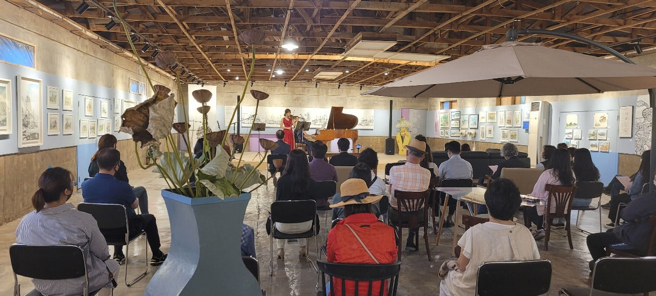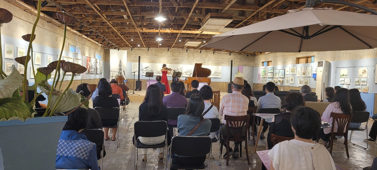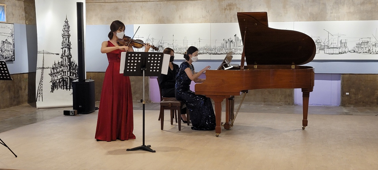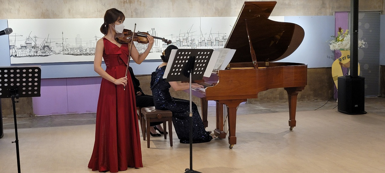 오후 5시 전시회 오픈 겸 토요 예술 무대에서는 바이올린 양지음 씨와 피아노 한아름 씨의 해설이 있는 듀오 콘서트가 열렸습니다. 한 시간 가량의 연주회에 여러 관객들이 가을 저녁 멋진 그림들에 둘러싸여 아름다운 선율에 푹 젖었습니다.