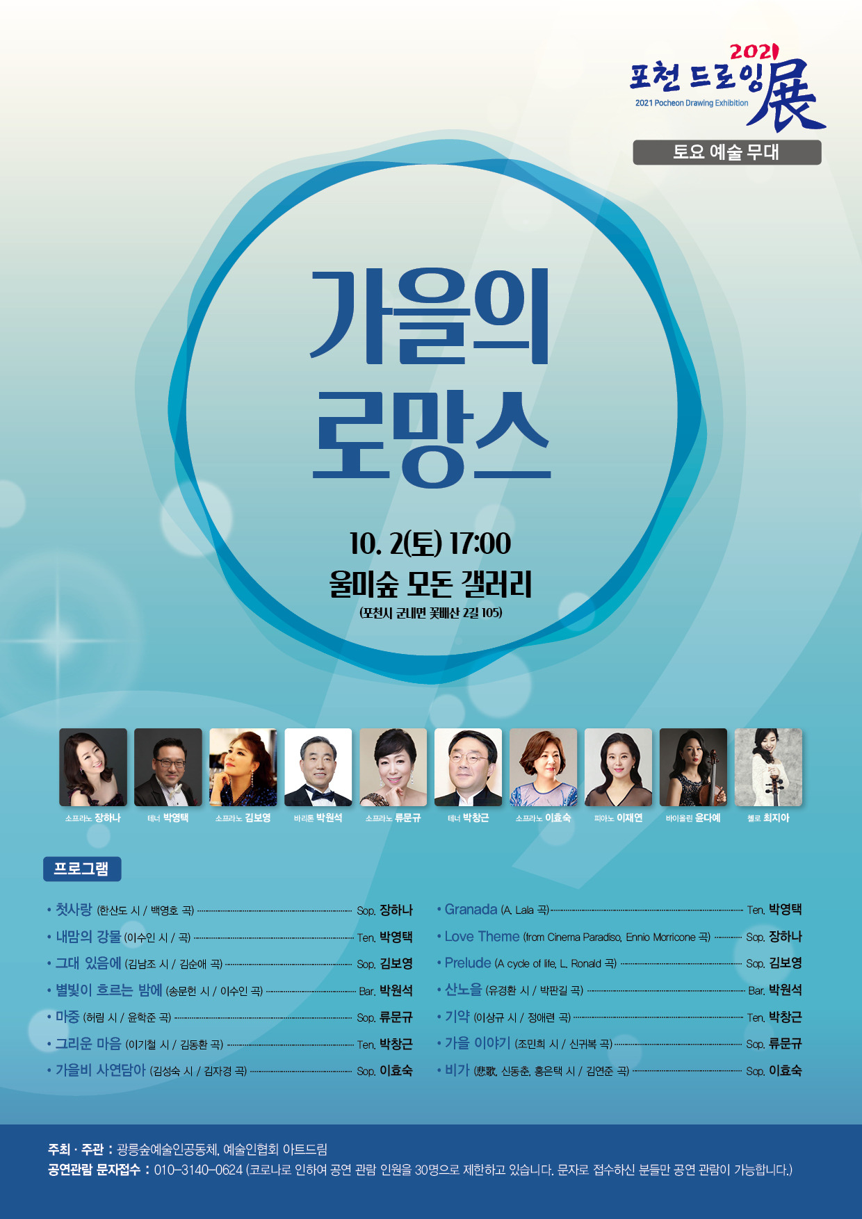 다음 주 토요일(10.2)에는 7명의 성악가들이 우리 가곡으로 준비하는 <가을의 로망스>가 기다리고 있습니다.