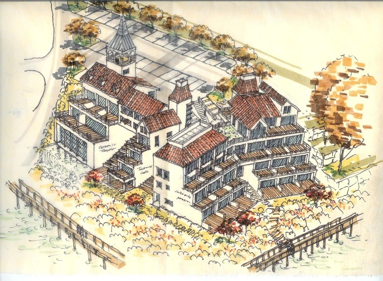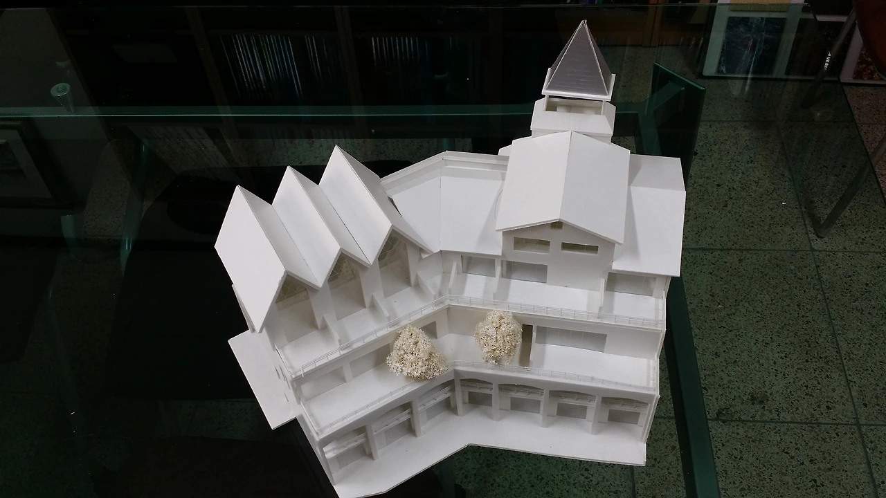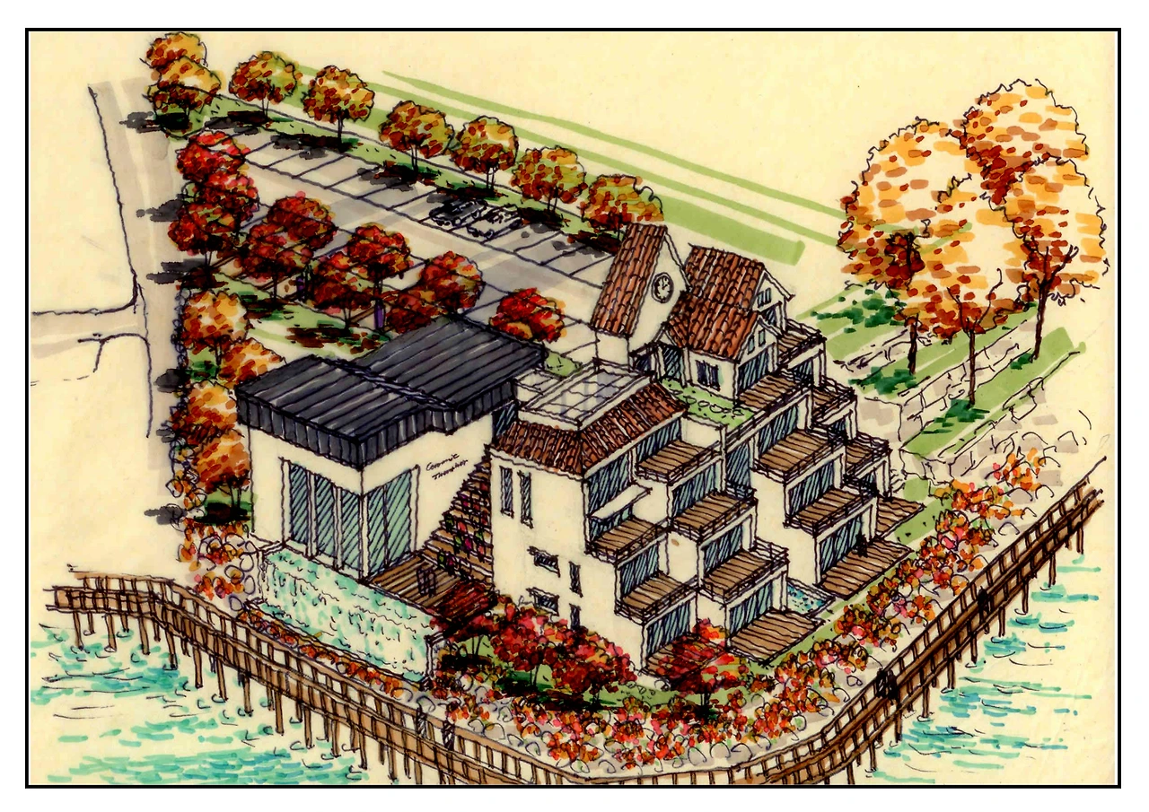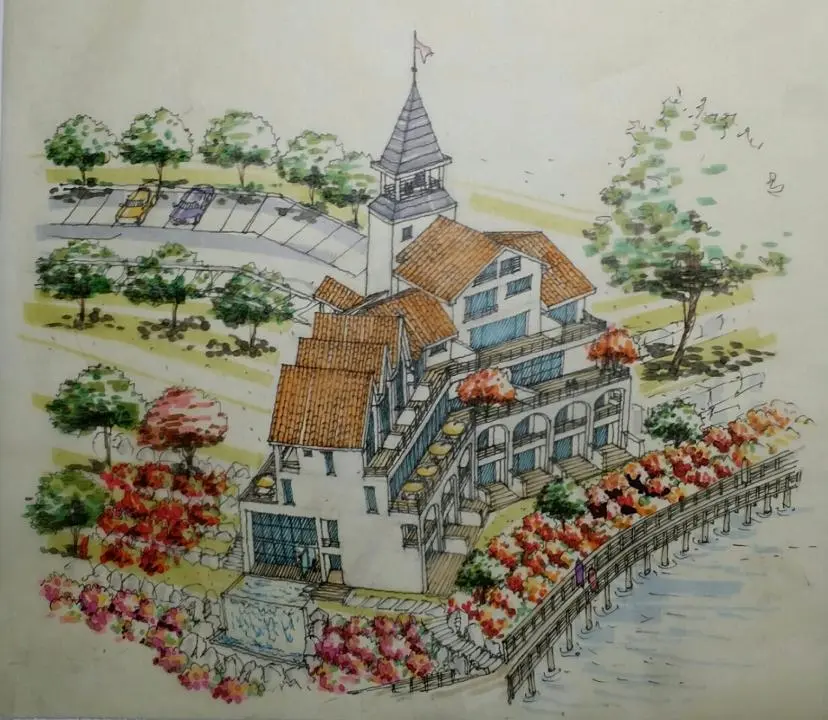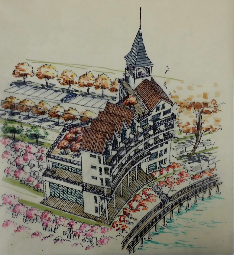서울에 사는 나이 지긋한 여사장이 건축주였는데 나는 모텔보다는 가족단위의 가족호텔 또는 펜션을 건립하고 다양한 문화활동이 가능한 다목적 홀을 건립하면 모텔못지 않은 수익과 다양한 문화활동을 통한 많은 이용객을 유치할 수 있을 거라 설득하고 저수지와의 레벨차를 이용한 멋진 건물을 지을 수 있다고 설득하였다.