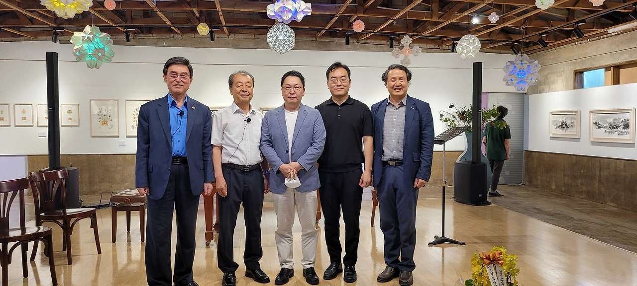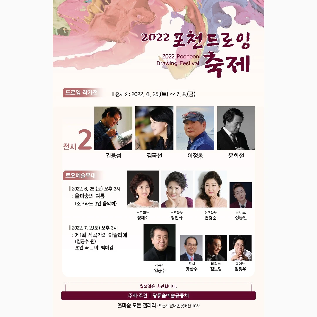 2022 포천 드로잉축제 <드로잉 작가전> 2조(이정봉, 김국선, 권용섭, 윤희철)의 전시가 진행되고 있는 둘째 주 토요일(7.2) 제1회 <작곡가의 아뜰리에>(임긍수 편)가 열렸습니다. 임긍수 작곡가의 신곡 <아! 백마강>을 작시가 공한수, 바리톤 김보람, 피아노 임정우 4인의 대화를 통하여 곡을 완성해 가는 모습을 무대에서 보여주었습니다. 참여한 관객들은 악보를 보면서 그들의 대화와 김보람 씨의 연습과정을 통하여 곡을 대부분 익힐 수 있었고 후반부에는 함께 곡을 부르는 시간도 가졌습니다. 마지막에는 소프라노 김보영 씨가 무대에 올라 즉흥 관객 연주를 해 주었습니다.