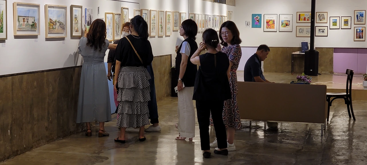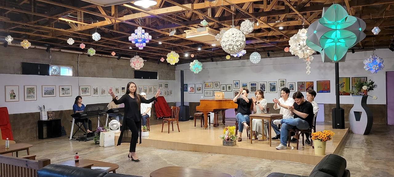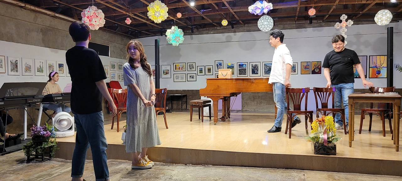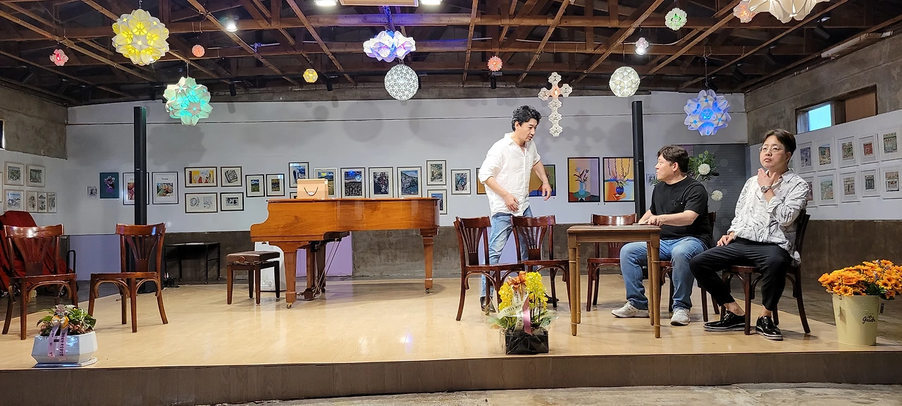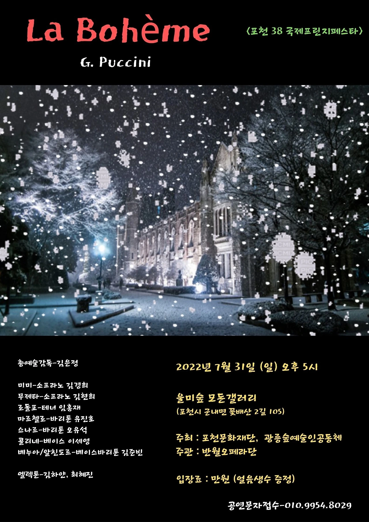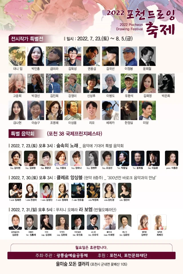 포천 드로잉축제 3조(박경신, 김진희, 고윤희, 강영미, 신상후)의 전시가 목요일(21일)로 끝나갑니다. 22일(금)에는 <전시작가 특별전>으로 금번에 참여하고 있는 작가 25명 전원의 작품이 DP됩니다. 각자의 대표작들이 전시되는 만큼 다양한 작품들을 감상하실 수 있을겁니다. 이 전시 기간은 포천문화재단에서 주관하는 <포천38 국제프린지페스타> 기간이어서 포천문화재단의 후원으로 비중있는 3개의 음악회가 마련됩니다. 23일(토) 오후 3시에는 서울 음악단체 <음악에 기대어>의 10명의 성악가들이 마련한 음악회, 30일(토) 오후 3시에는 해외 유학파로 구성된 <클네르 앙상블>의 현악 8중주가 마련됩니다. 31일(일) 오후 5시에는 푸치니 오페라 <라 보엠> 전 악장이 공연됩니다. 어제 저녁에는 라 보엠 리허설이 있었습니다.