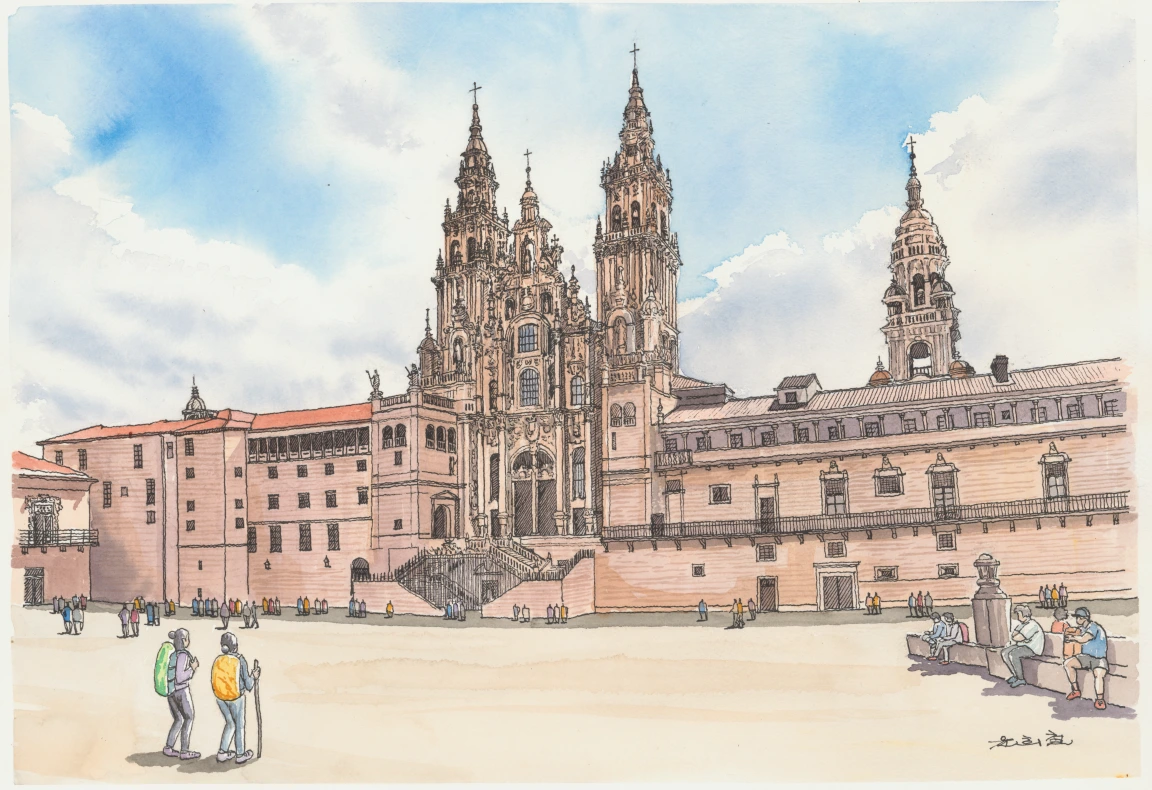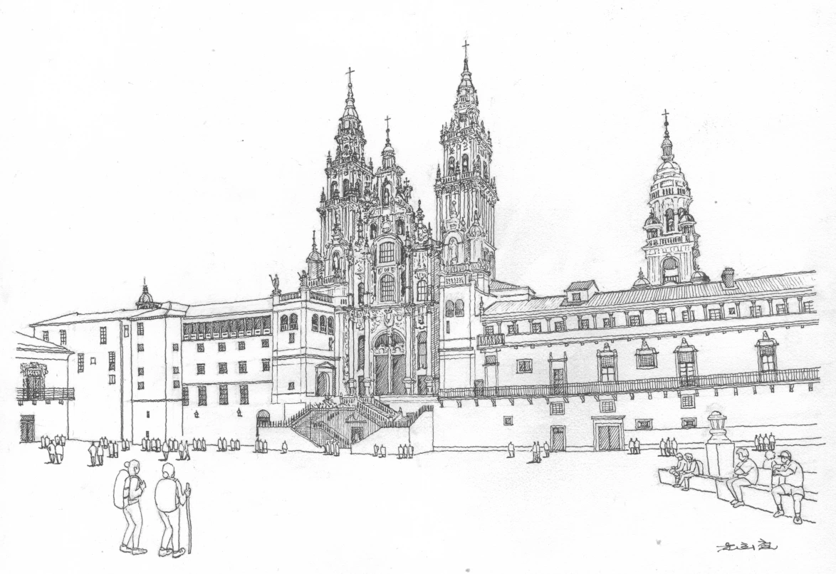 해외 건축 드로잉을 다시 시작했습니다. 해외건축 시즌2 입니다. 첫번째 그림은 스페인 서쪽에 위치한 산티아고 데 콤포스텔라 성당입니다. 산티아고 순례길의 종착지이지요. 예수가 십자가에 못박히자 그를 따르던 제자들이 모두 흩어졌는데 열두 제자 중 야고보는 스페인으로 가서 복음을 전파하였다 합니다. 그는 7년 후 고향인 팔레스타인으로 돌아와 그곳에서 순교를 하게 됩니다. 순교하기 전 야고보의 유언에 따라 그의 유해는 스페인 땅에 묻히게 됩니다. 그런데 묻혀진 자리가 알려지지 않은 채로 있다가 800년이 지난 후 한 은둔자가 야고보의 유해가 묻힌 장소를 계시를 받습니다. 계시에서 알려 준 자리를 가서 조사한 끝에 결국 그의 무덤을 발견하게 됩니다. 이후 기독교인인 스페인 왕은 이슬람에게 정복되어 있는 이베리아 반도를 탈환(레콩키스타)하기 위해 야고보의 무덤이 있던 자리에 성당을 건립하게 됩니다. 성당의 건립으로 인해 기독교 군이 계속 승리를 얻게 되자 야고보는 스페인의 수호성인으로 추대됩니다. 그리하여 그 도시와 성당의 이름을 성인 야고보의 스페인식 이름인 ‘산티아고(Saint Diego)’로 부르게 되었습니다. 도시와 성당의 정식 명칭은 ‘산티아고 데 콤포스텔라(Saint Diego de Compostella)’인데 이는 ‘별(stella)이 반짝이는 벌판(campus)’이라는 뜻이랍니다.