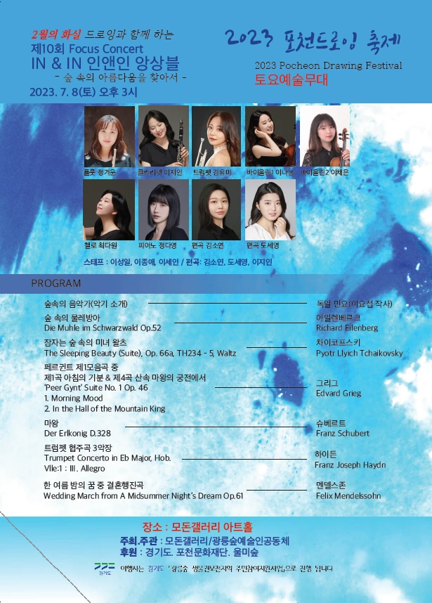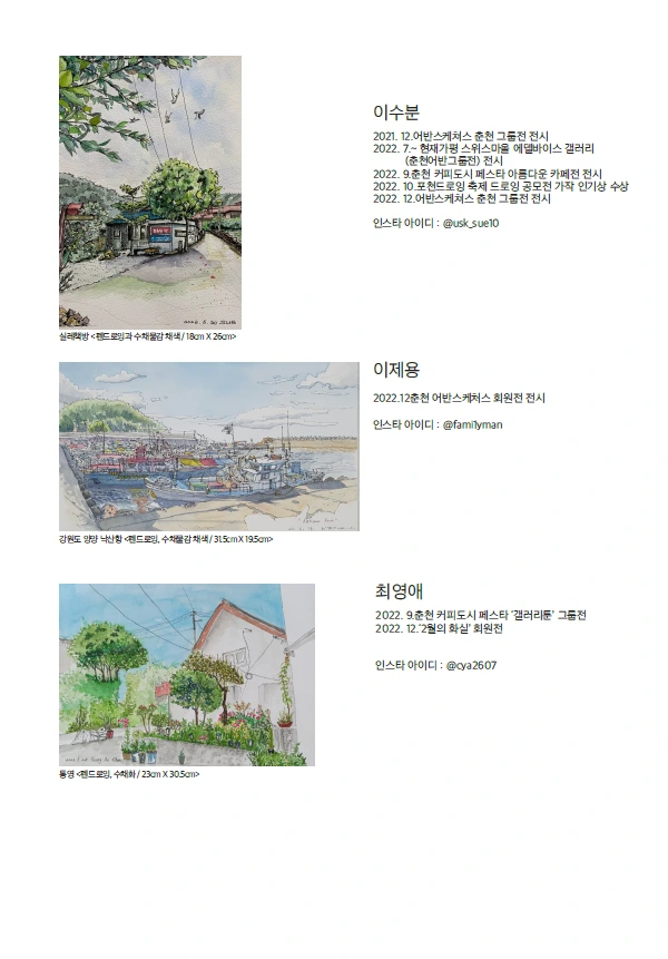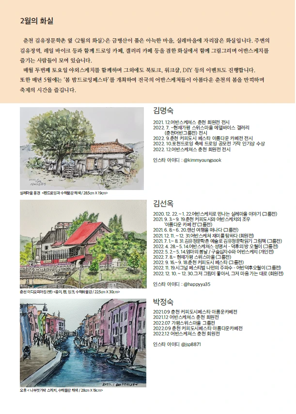 오는 토요일에는 동행전 3으로 춘천 김유정 문학촌을 기반으로 활동하고 있는 <2월의 화실>의 작가들 작품이 전시됩니다. 오후 3시에는 매년 유망한 젊은 아티스트를 발굴하고 지원하는 음악 프로그램인 <focus concert>가 10회를 맞아 기악 연주팀인 <IN & IN 인앤인 앙상블>의 음악회로 열립니다. 회를 더해갈수록 전시하는 팀들의 열정과 아이디어가 돋보이는 전시로 관람객들의 탄성을 자아내게 하는데 이번 전시는 어떤 모습일까 자뭇 궁금해집니다. 음악회가 마치면 전시 작가들이 내놓은 작품이나 굿즈로 진행되는 경품 추첨도 놓칠 수 없는 행사입니다.
