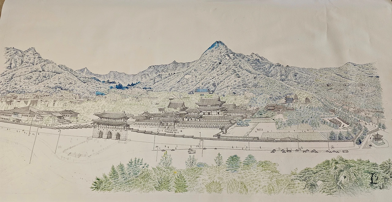 경복궁 시즌3(240cm x 130cm)의 전체적인 윤곽이 그려졌다. 전체를 핸드폰 화면에 담으려니 사다리를 타고 올라가야 된다. 앞부분 나무들 얼추 완성하고 건물들이며 뒷부분 북악산의 디테일 작업에 들어가려 한다. 추석 연휴때 하늘을 제외하고는 완성해 보려 하는데 계획대로 될지 모르겠다.