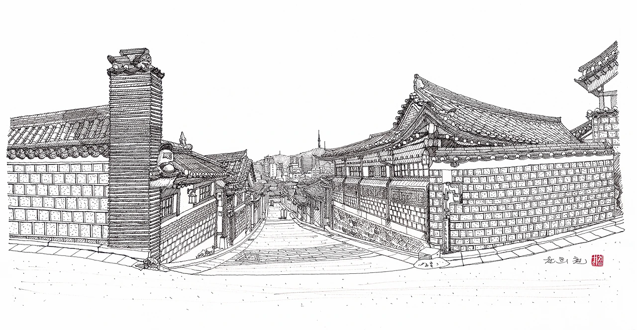 북촌로 길가에서 바라보이는 한옥거리와 뒤쪽 경사지를 따라 한옥들이 중첩되어 펼쳐져있는 모습이다. 한옥이 집단화되었을 경우에 살펴볼 수 있는 우리 건축의 미가 잘 드러나는 정경이다.