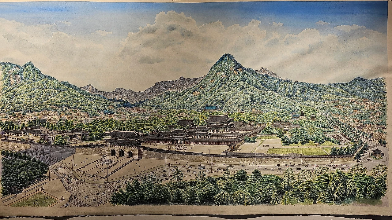 가로 2.4m x 세로 1.3m(150호 변형) 경복궁 전경 기본적인 채색이 완료되었습니다. 이제 전체적으로 강약을 주는 작업에 들어가려 합니다.