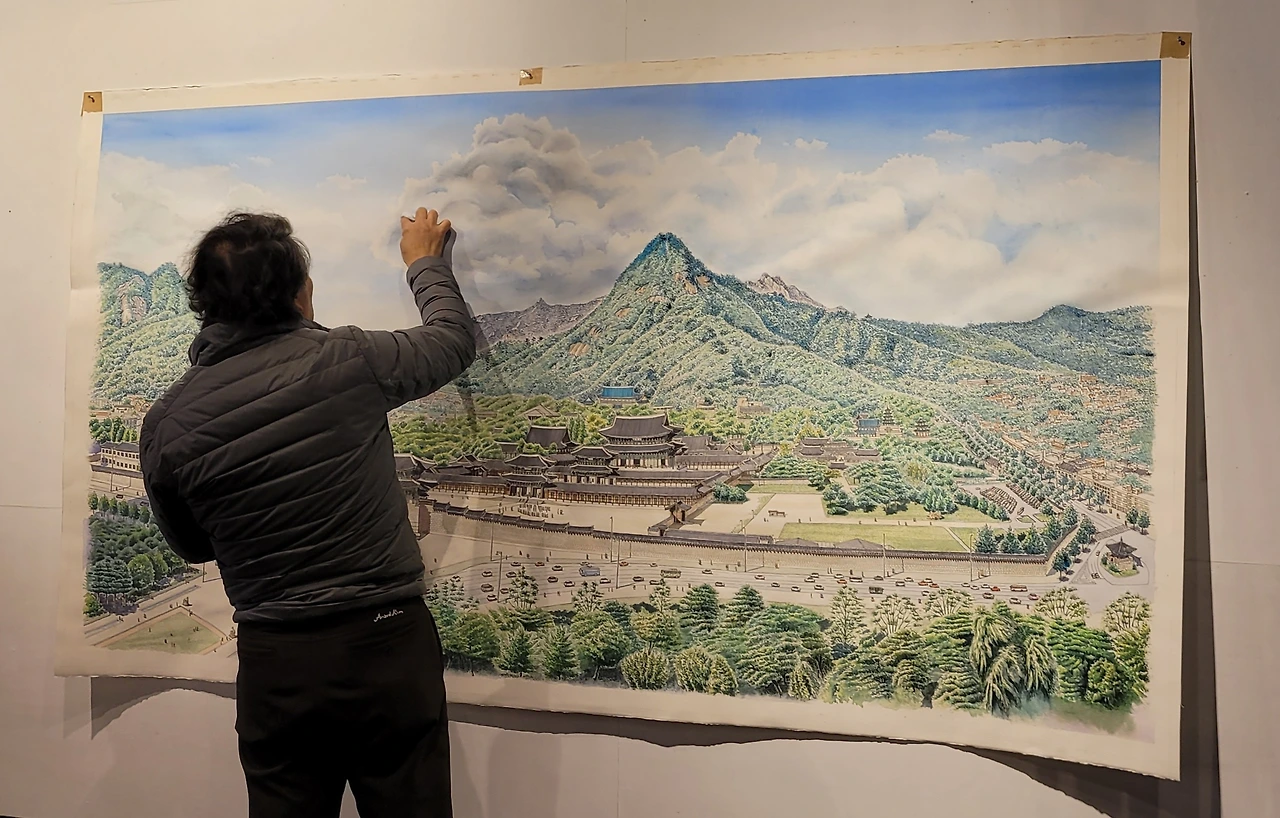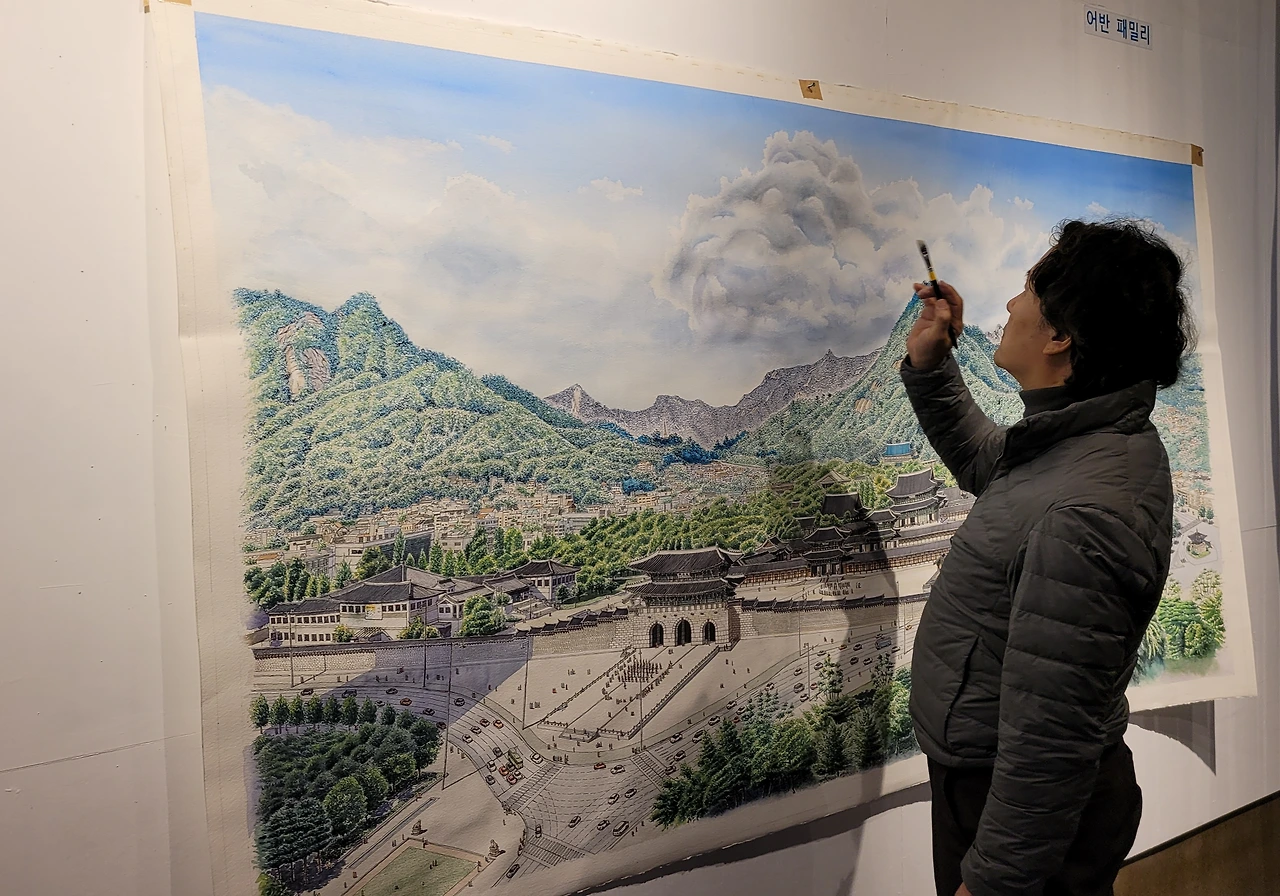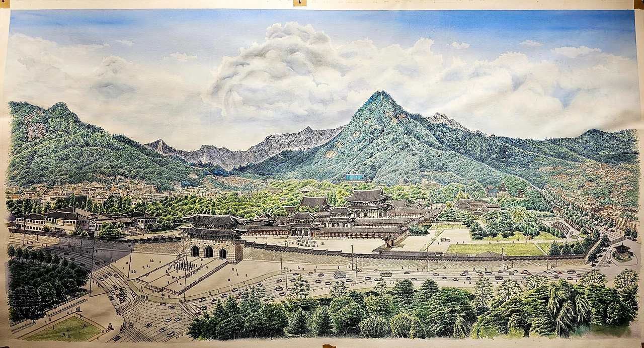 가로 2.4m x 세로 1.3m(150호 변형) 경복궁 전경에서 구름과 전체적인 채색 보완 작업중입니다.